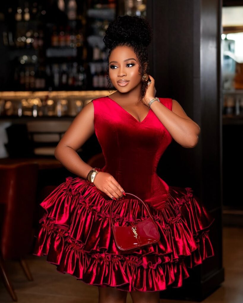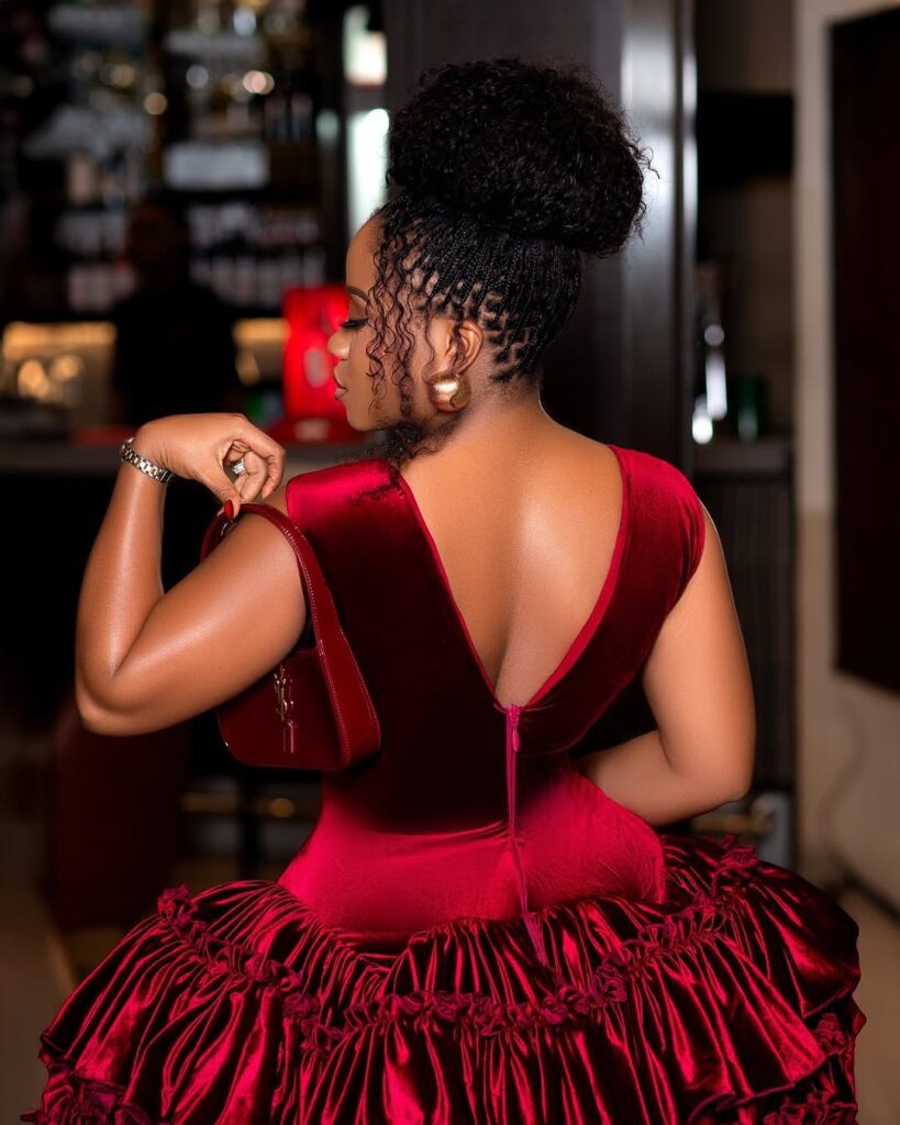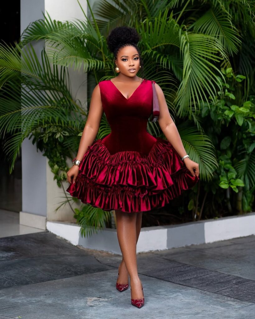 She’s wearing a deep wine-red velvet dress that hugs her upper body perfectly and flares out into a double-layered ruffle skirt that’s full of volume and charm.
