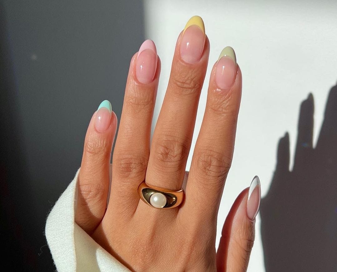 Negative space nail designs are nothing new, but when combined with spring-ready colours like baby blue, butter yellow and pale green, they feel fresh and light again.