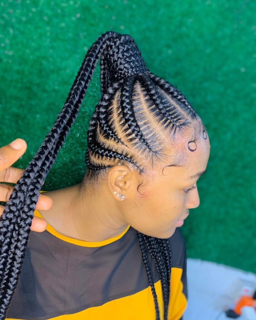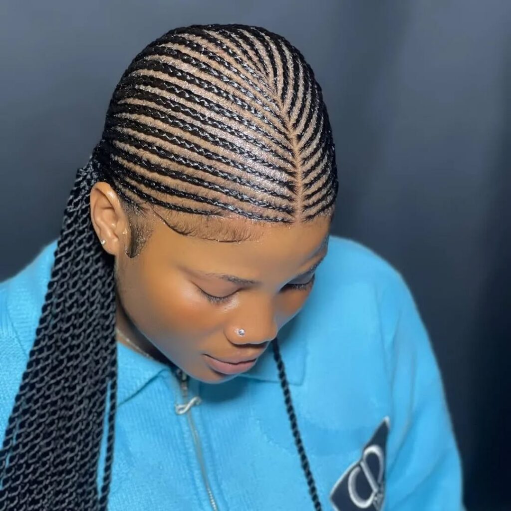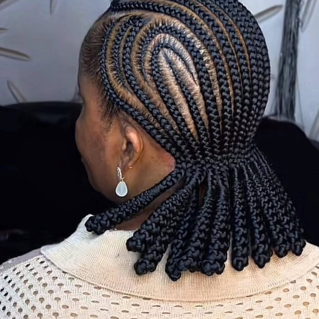 If you have never had Shuku at least once, have you ever been to school in Nigeria? Probably the most classic one, where they braid your cornrows upwards into a neat bun on top, sometimes with cute variations such as banana-shaped shuku ologede. It said, “I am ready for class,” and was adored for its neatness, albeit with the price of an aching head for days from those tight braids. From its origins in Yoruba culture, once worn by queens, it is still rocking today for that classic African touch.