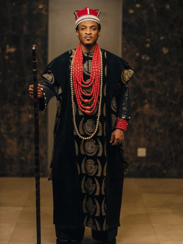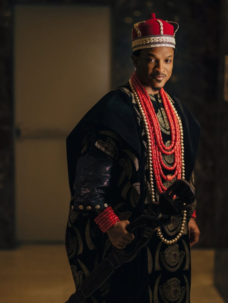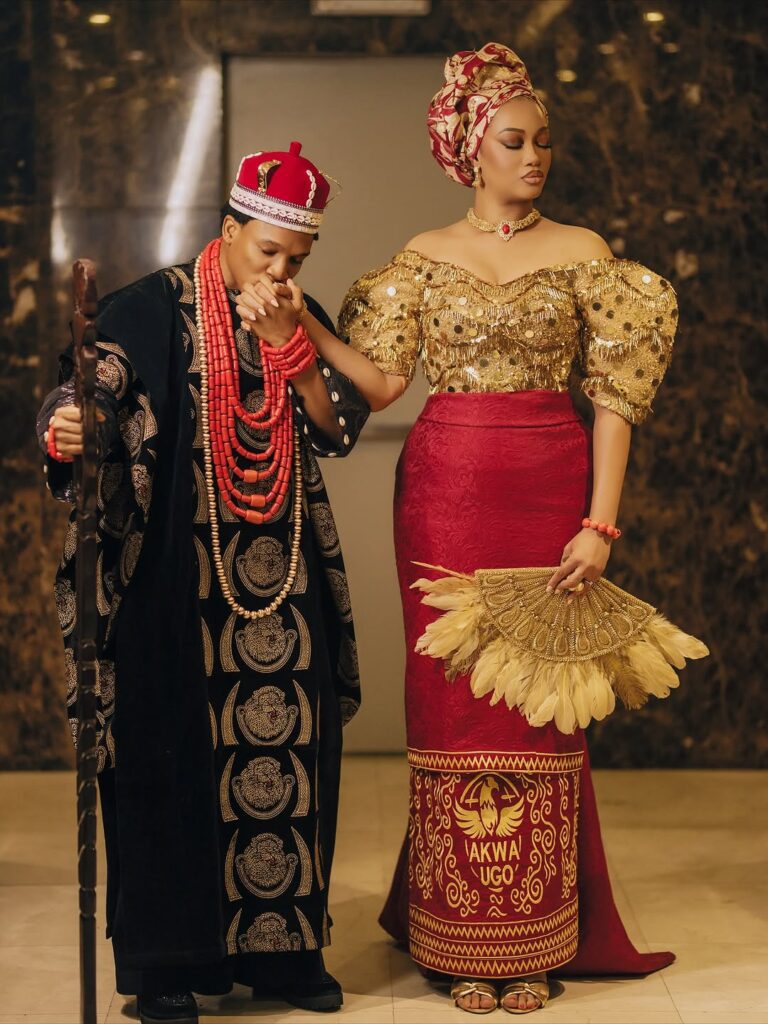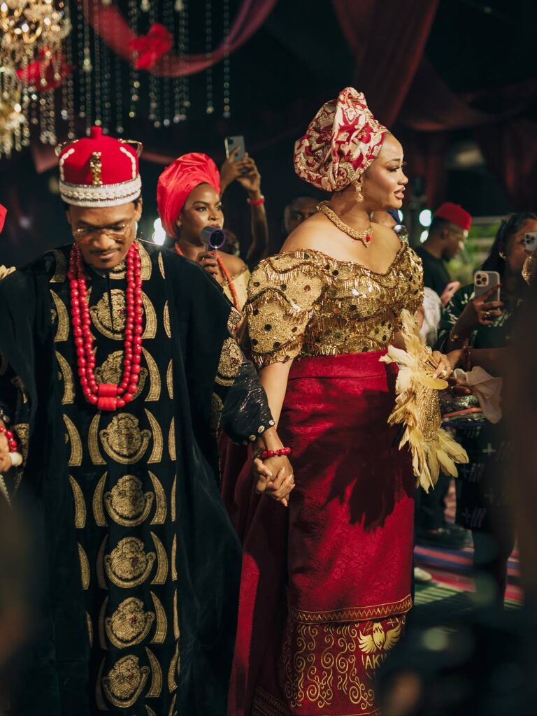 Emeka matched in an elegant agbada in a rusty, complementary hue, woven with gold thread that swung from his arms lightly with every move. Topping it with a cap that was adorned with cowrie shells, symbolizing prosperity and protection. Colorful coral necklaces around the neck of both? Total couple goals, uniting them visually and spiritually. This look set the warm and inviting tone for family and friends arriving for the first blessings.