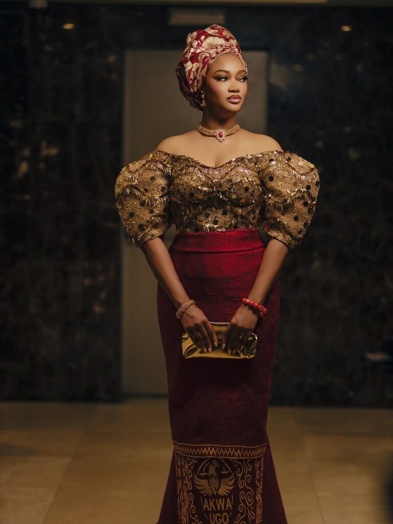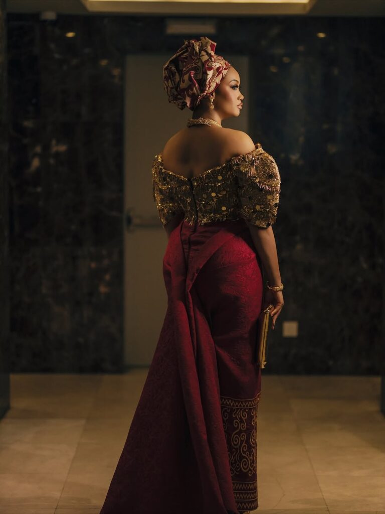 Then came the second look, the heat is on. Moving into brighter colors, Chidera chose a fitted iro and buba set in fluorescent orange adire print. Meanwhile, the indigo resist dye patterns tell tales of resilience and artistry passed down for generations. The skirts were layered just right for a peplum top that showcases the intricate embroidery of cowries and stars, said to symbolize her guiding light on the path ahead. Her gele was now more of a collar, tight and modern, giving her drop earrings room to swing like whispers of laughter.
