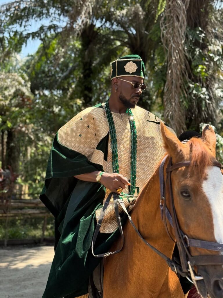 Picture this, green velvet agbada with gold embroidery that is just screaming elegance. And yeah, he’s on a horse. A horse, If that doesn’t make you want to grab the nearest stallion and strike a pose, I don’t know what will.