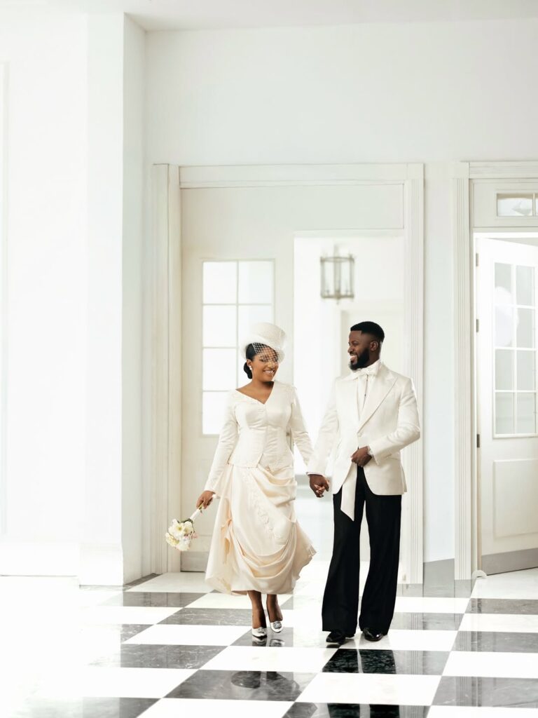 They step into this new chapter hand in hand, dressed in clean, refined looks that speak without trying too hard. Akin wears a sharp white blazer paired with black trousers, finished with a neat bow tie that keeps everything crisp and polished. Kikky stands beside him in a structured ivory outfit with a fitted top and flowing skirt. Her hat adds a gentle drama that lifts the whole look without taking away from its simplicity.