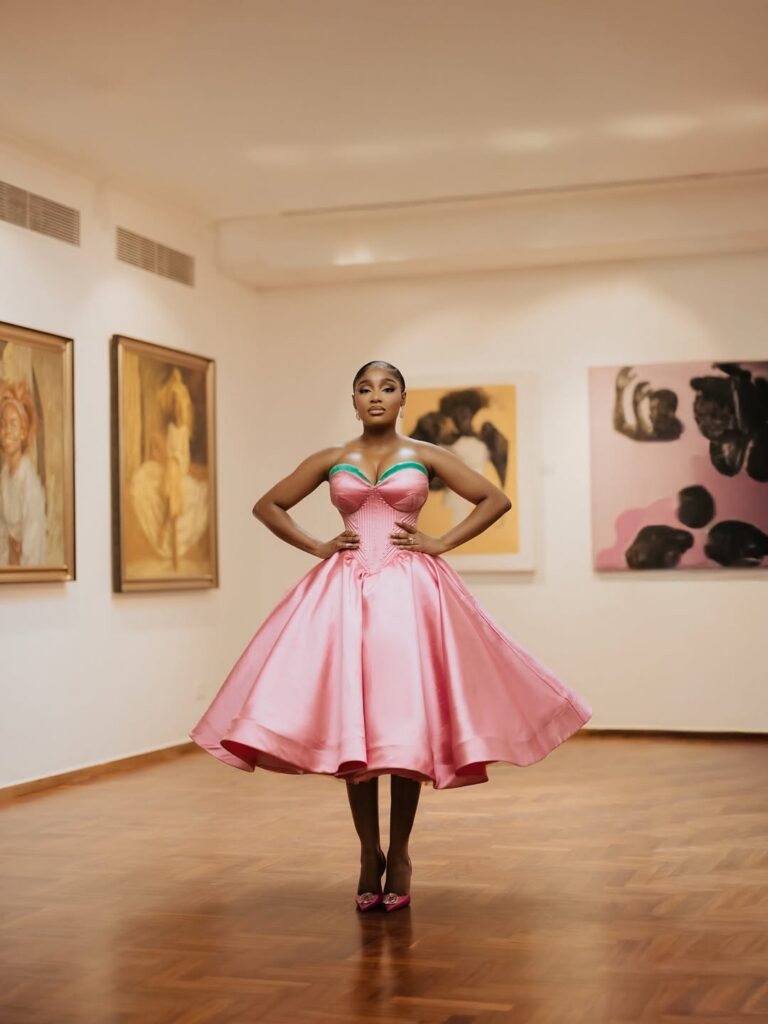 Kiky brings the drama in a pink dress that fits perfectly at the top and spreads out into a full skirt. As she stands, the dress holds shape. As she moves, it flows beautifully. The little pop of green at the neckline adds something unexpected and makes the whole look feel fresh.