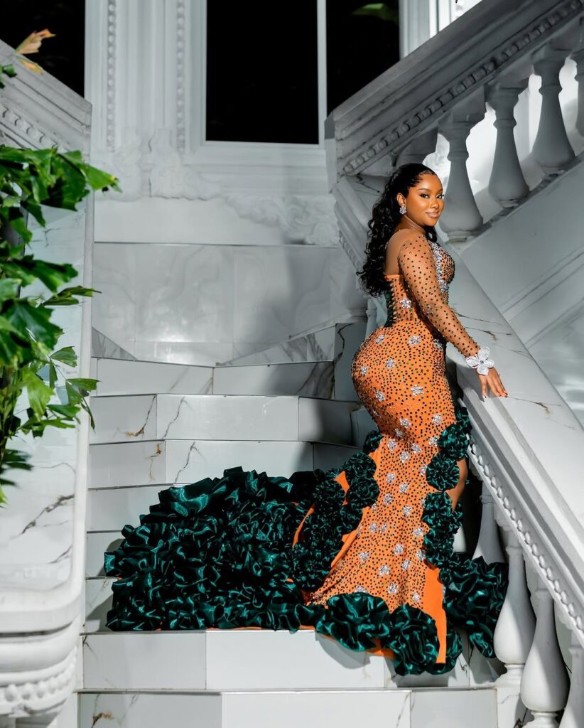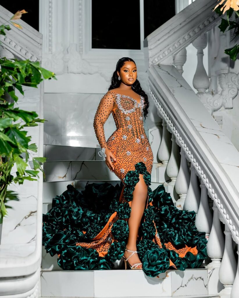 The sleeves are sheer and snug, giving a soft, light touch that balances the fitted design. It keeps the gown easy to wear while still looking bold, a must for reception comfort. From the knees down, the dress changes the vibe completely. A front slit lets you move, dance, and enjoy the night. Deep green ruffles at the hem add drama, trailing behind as you walk and creating eye-catching movement with every step.