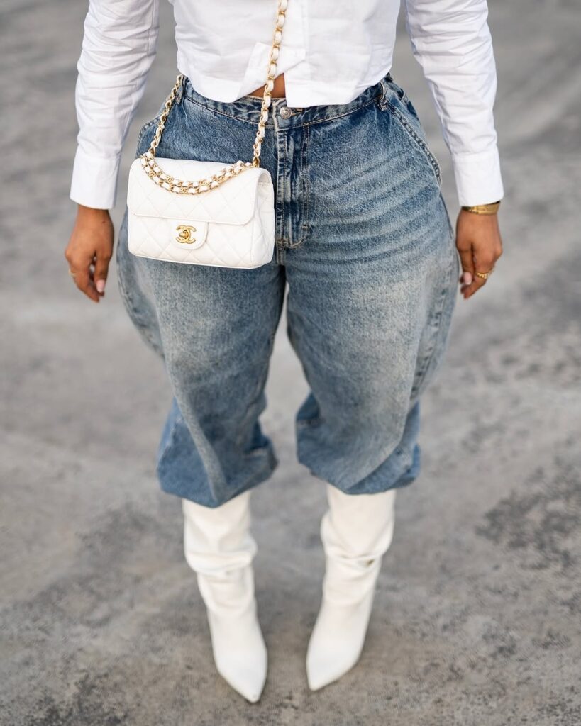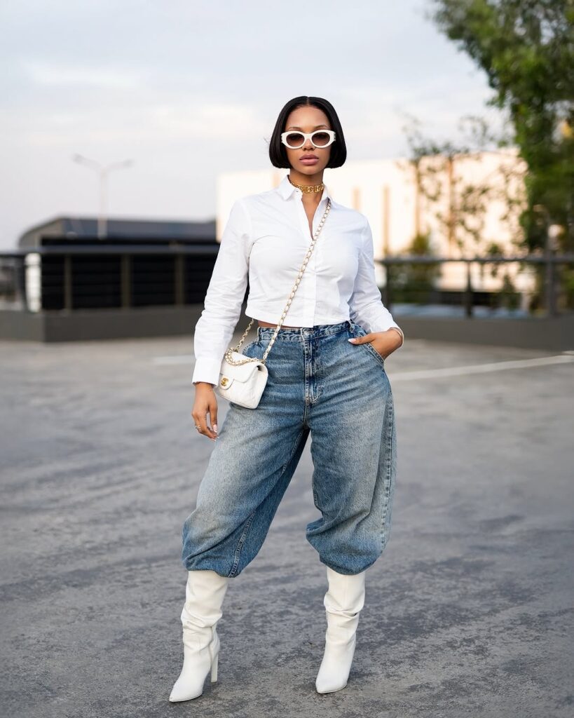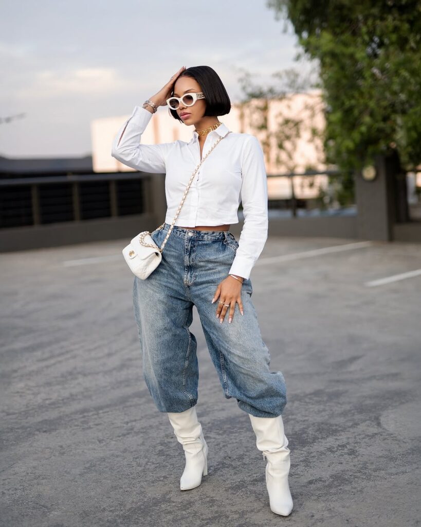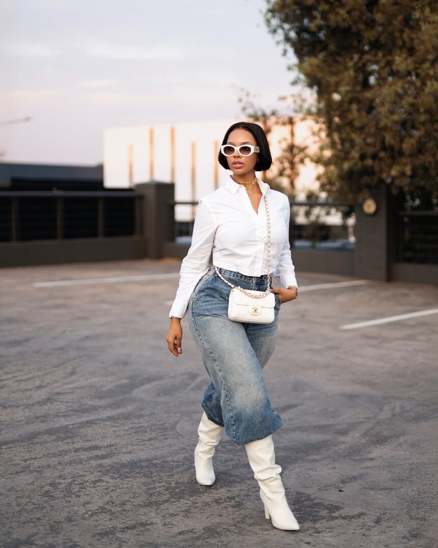 The white knee-high boots are the star of the look. They add boldness and elevate the outfit instantly. This is how you turn simple denim into a fashion moment. Strong, chic, and eye-catching.