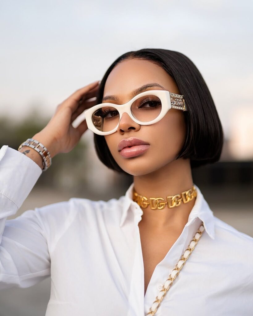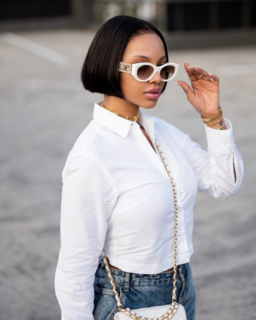 Accessories keep it stylish and intentional. The mini white bag with a gold chain brings soft luxury, while the white sunglasses and gold neck detail add that extra fashion edge.