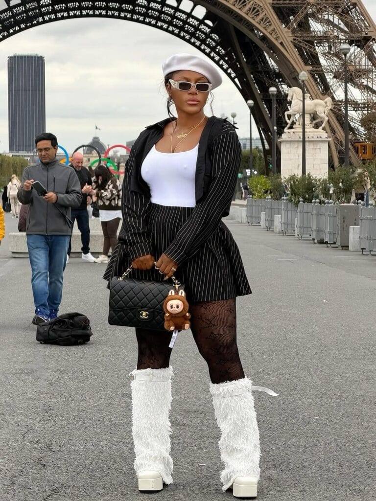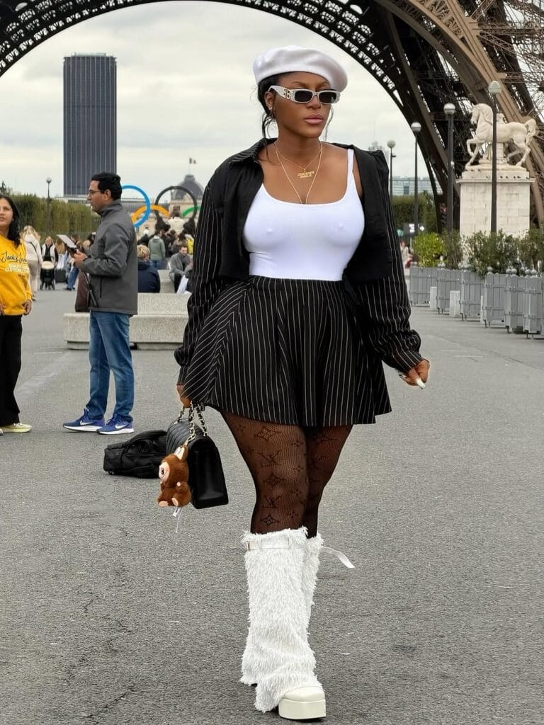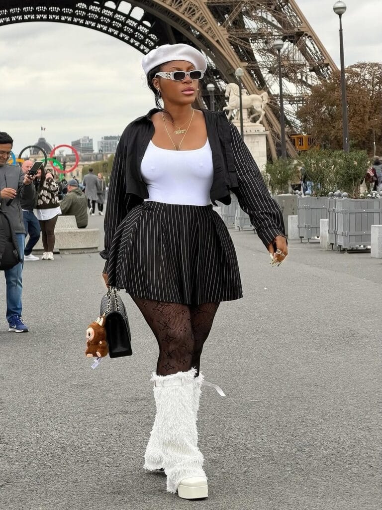 Her platform furry boots steal the show. The plush white design adds both drama and warmth, turning the classic black-and-white outfit into something runway-worthy. The height from the platform sole adds length to the legs, while the fuzzy detail softens the overall look. She finishes with a black quilted handbag, keeping the outfit balanced and fashion-forward.