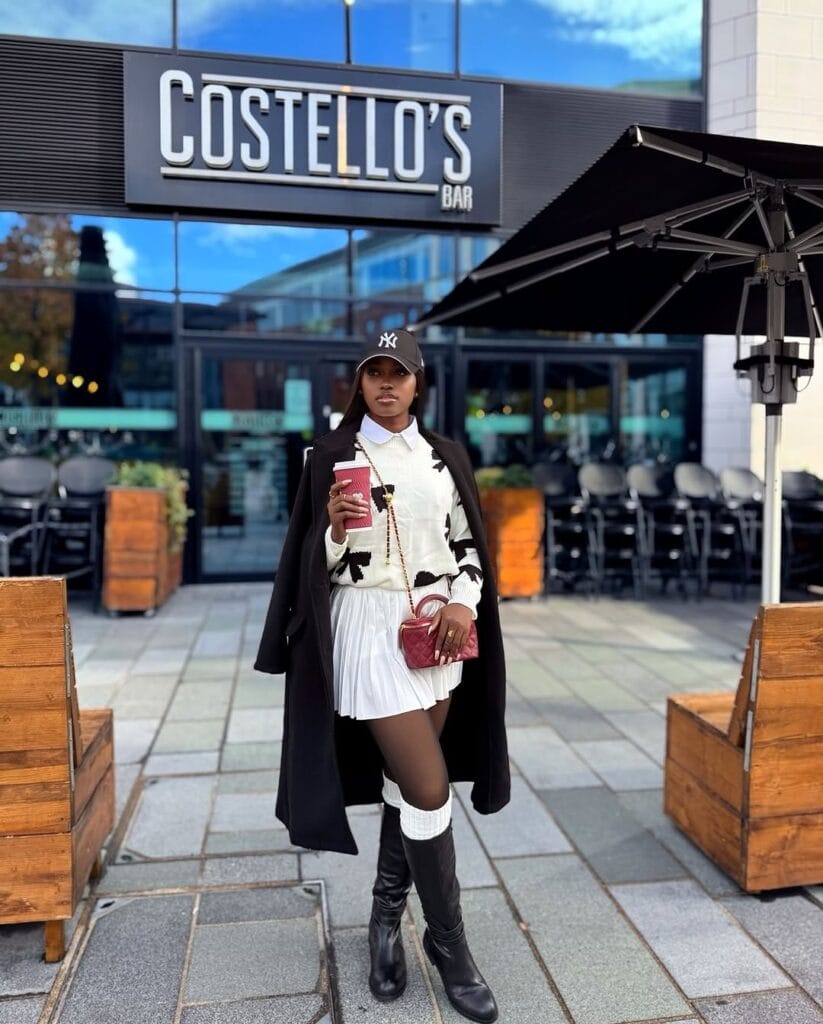 This look is giving an effortless city girl. She keeps things classic with a white pleated skirt and a cream sweater that has black floral details. Underneath, there’s a crisp white collared shirt peeking through, which makes the outfit look neat and preppy.