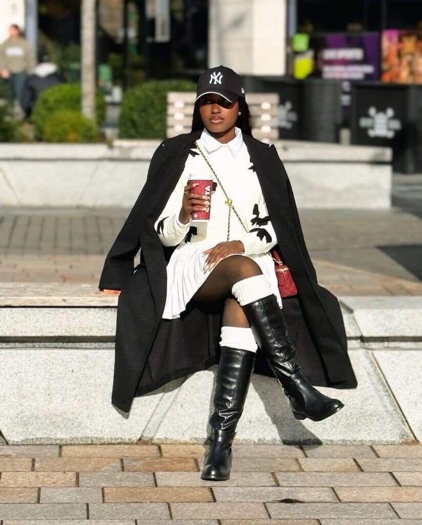 To pull it all together, she throws on a long black coat that instantly adds some boss energy. And then comes the real statement, her knee-high leather boots. Sleek, fitted, and super stylish, they balance out the playful skirt and make the look feel put-together.