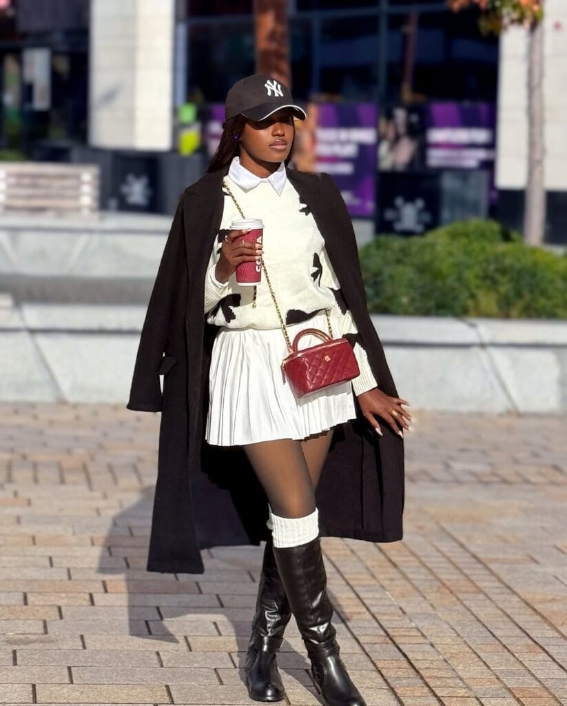 The accessories make the look even better. A deep red quilted mini bag adds a pop of color, while the baseball cap gives it that relaxed, street-style finish. She looks like she just walked out of a fashion magazine without even trying too hard. That’s the charm of knee-high leather boots; they make everyday outfits feel effortlessly chic.