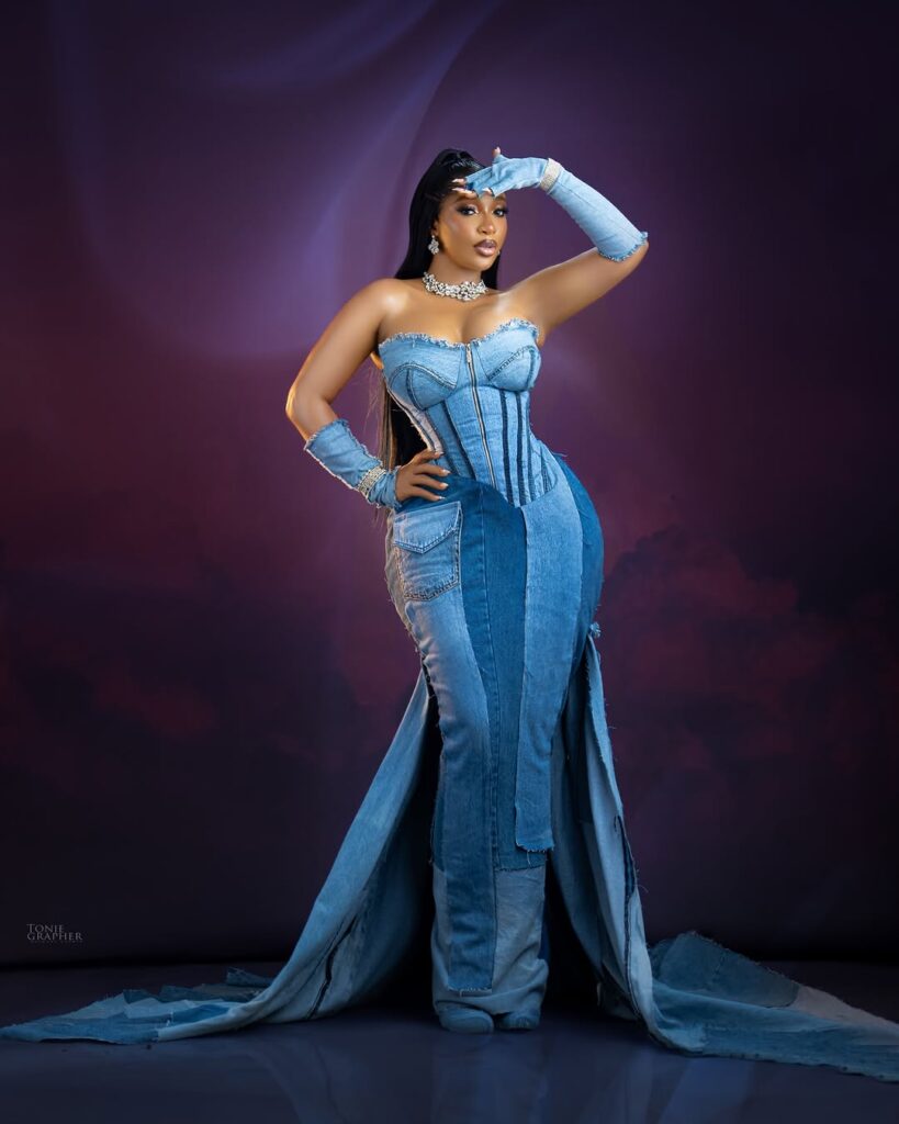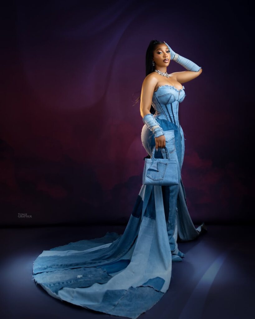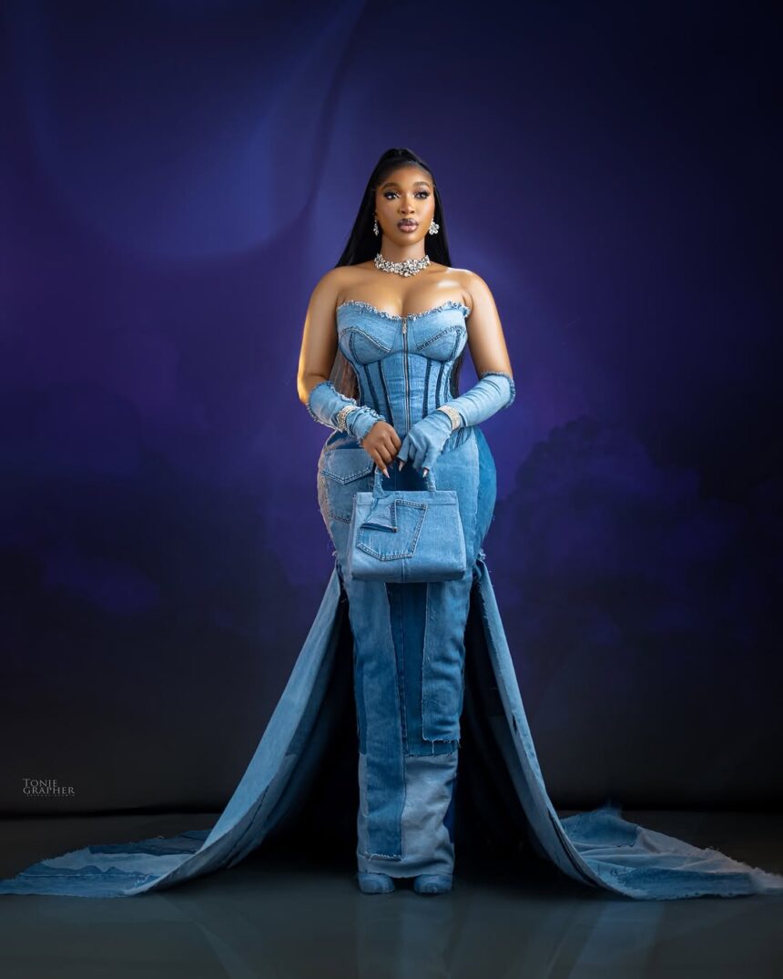 The down part of the outfit is where the drama lives. It fits close to the body and then flows out into a long train that brings that luxury feel. It moves with ease and gives every step a strong presence. The denim texture keeps it fresh and modern while the design keeps it elevated.