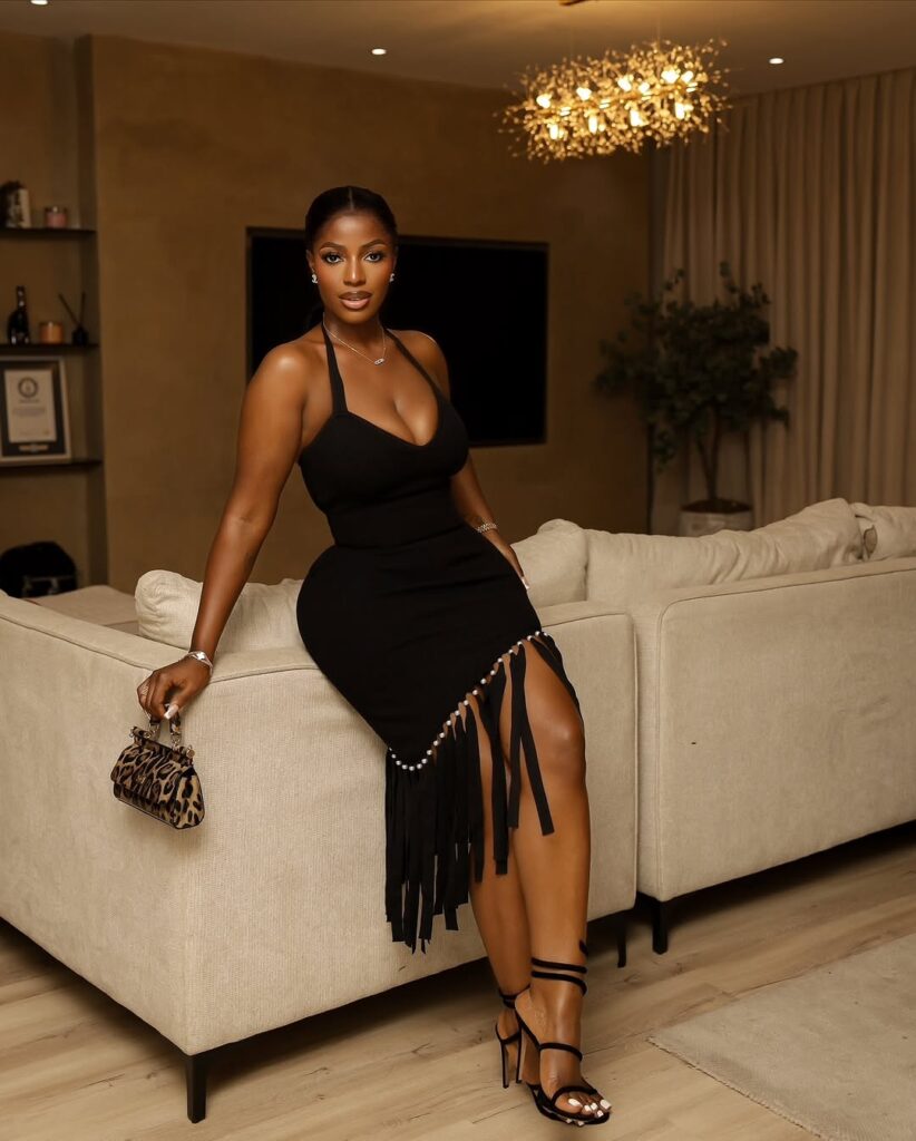 Hilda stepped out in a sleek black halter-neck dress that defined her curves beautifully. The fringe detail at the hem added just the right amount of glam, moving gracefully with every step. It’s that balance of elegance and flirtiness that makes this dress a total win for date night glam.