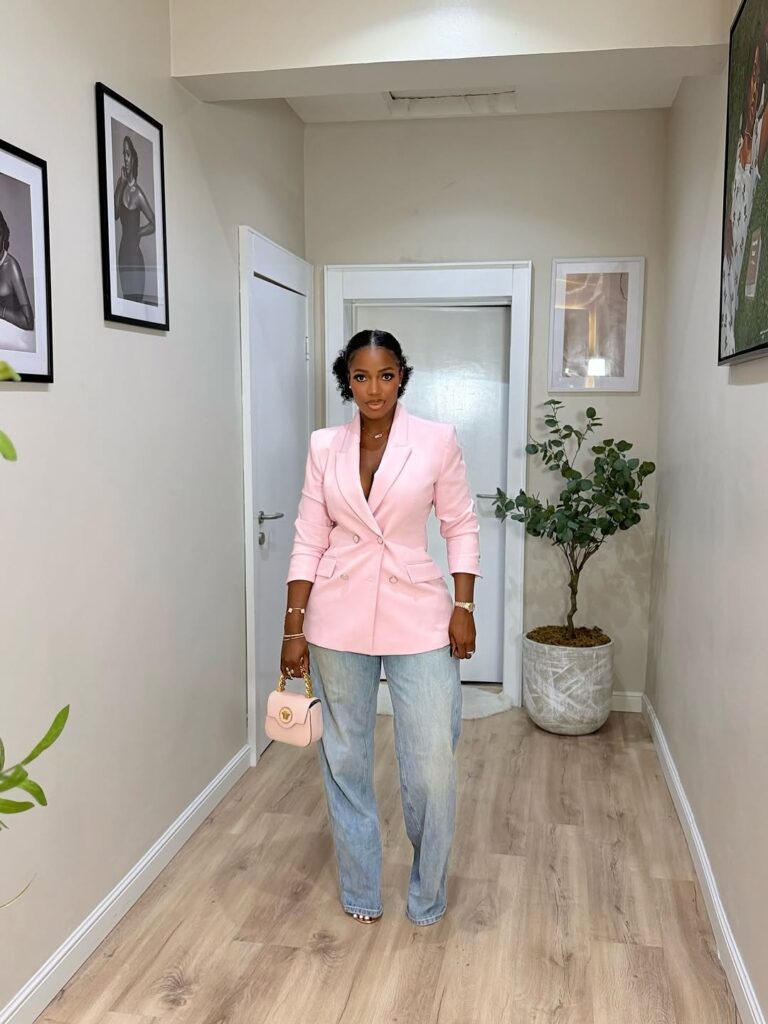 Her accessories are simple but effective. The mini pink handbag complements the blazer beautifully and adds a soft luxury vibe. Gold bracelets and a dainty necklace bring warmth and shine to the look, keeping it polished and classy.