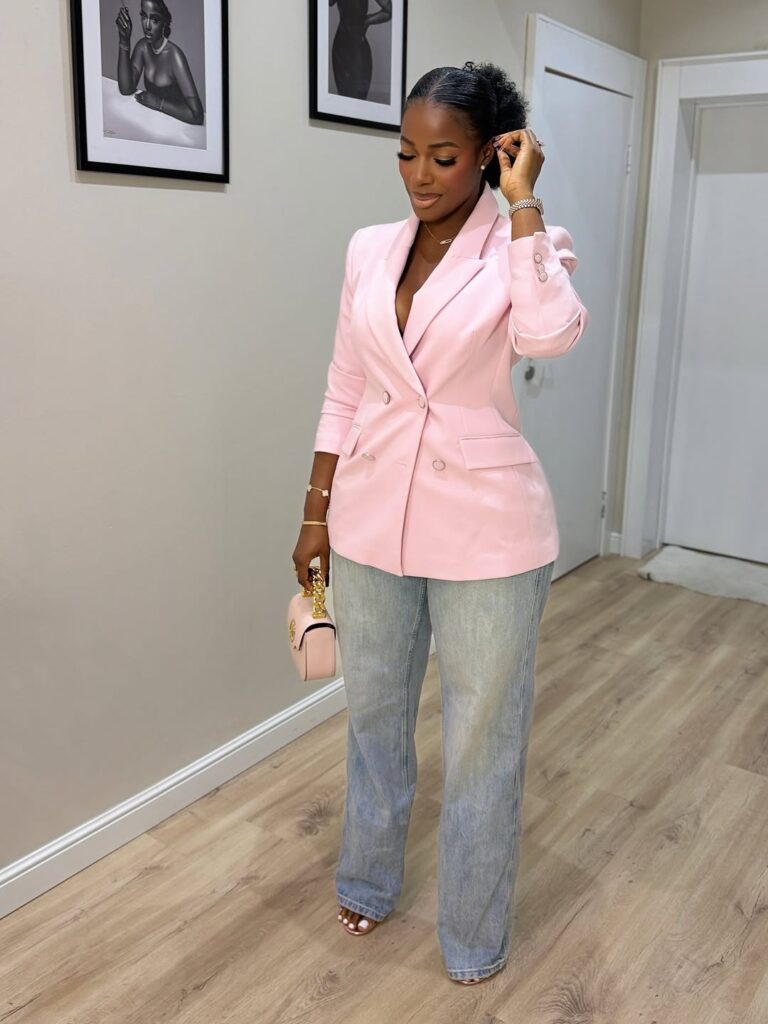 She paired it with light wash straight leg jeans, and the balance here is perfect. The denim tones the blazer down just enough, giving the look a cool and modern feel. This combo shows how powerful a blazer and jean pairing can be when styled right. It feels bold, stylish, and effortless all at once.