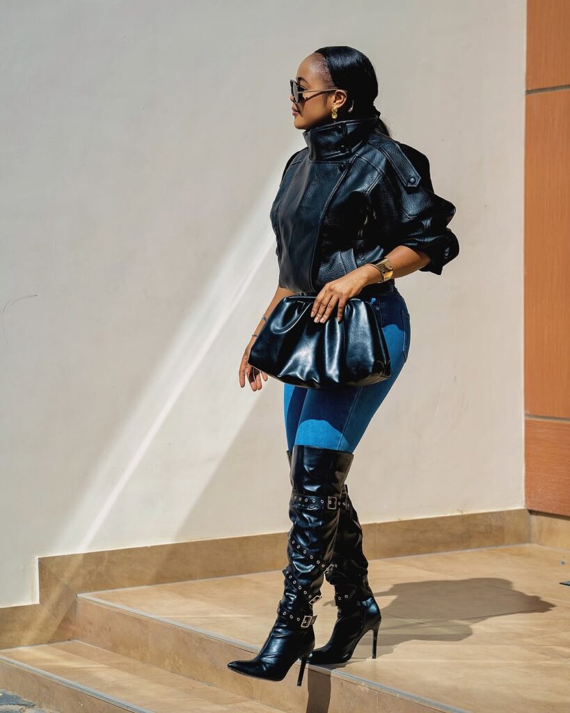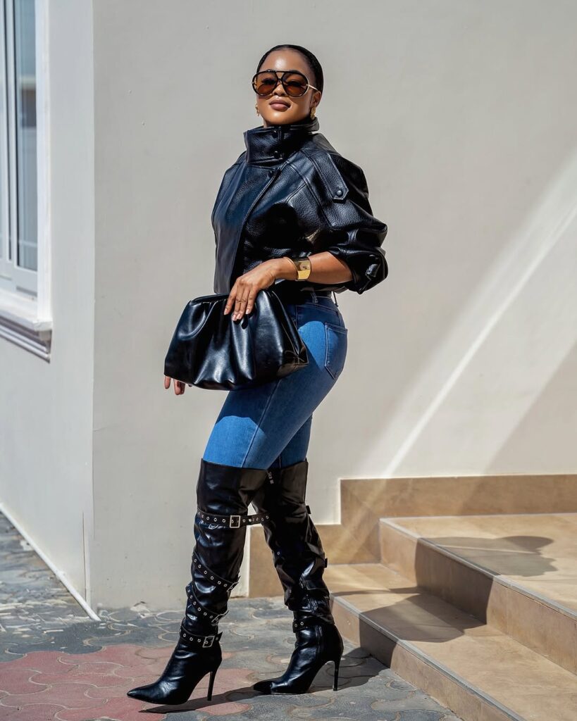 The thigh high boots and leather bag carry the outfit to a different level. Sleek, bold, and detailed, they bring that strong finish that turns heads. They make the entire look feel more defined and stylish.