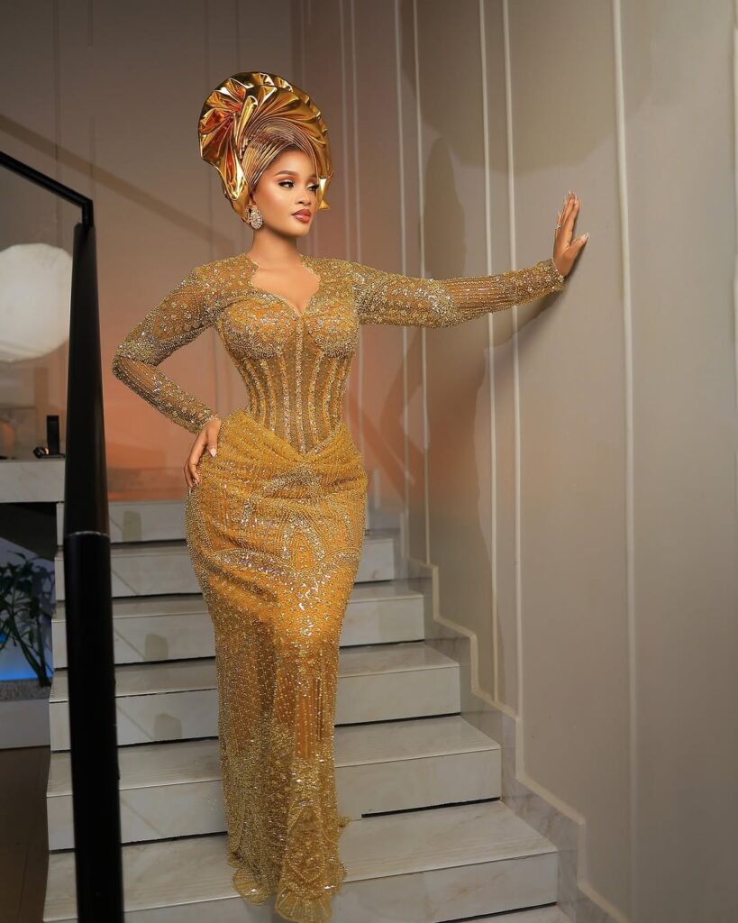 The gold gown is the star of the whole look. The fabric is covered with detailed beads and fine embroidery that shine softly with every step. It gives that luxury feel that fits perfectly with the spirit of a big Nigerian party. Gold always carries a sense of royalty, and this dress wears that feeling proudly.
