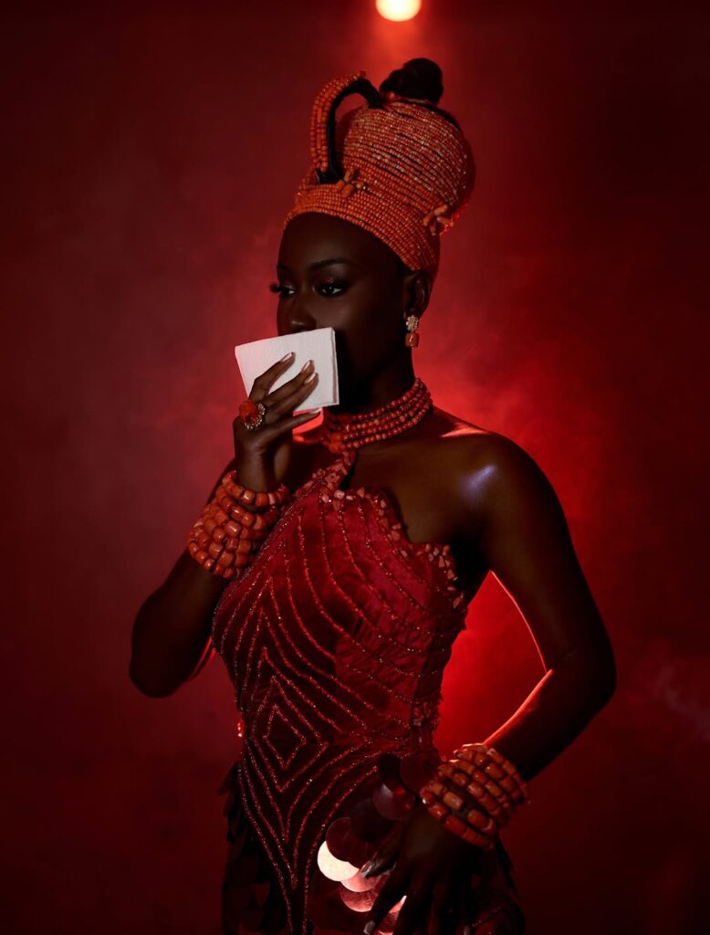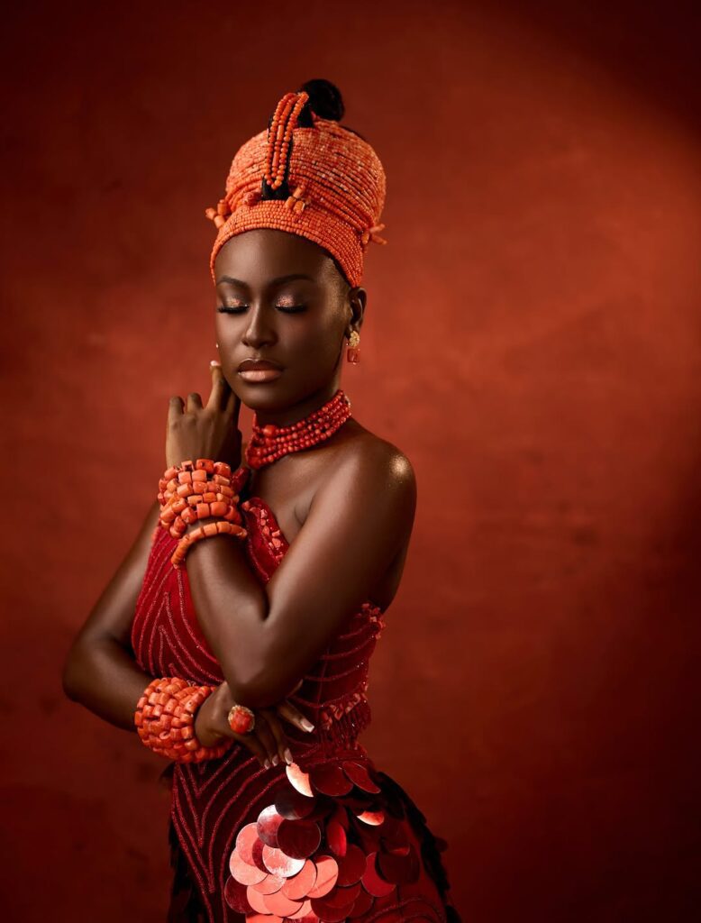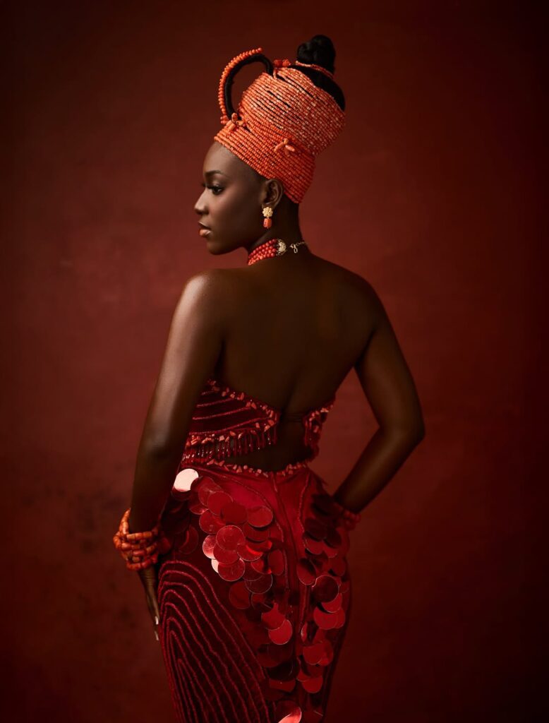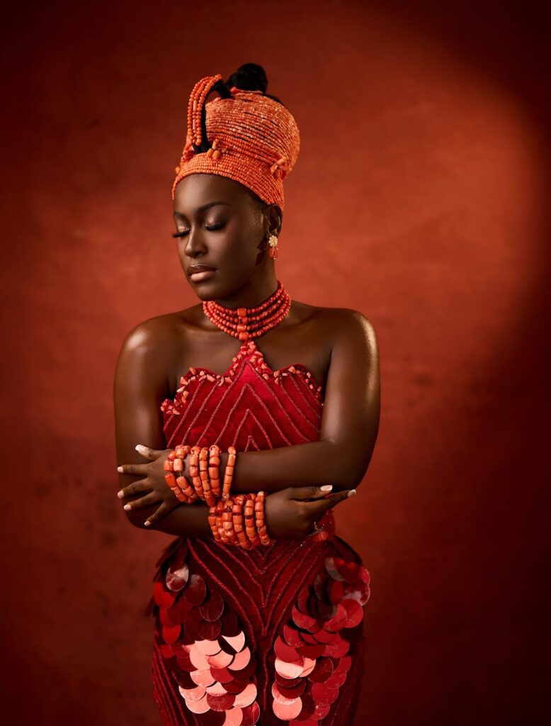 To make this look pop, the accessories do not disappoint. The coral beads used by Just Beadit NG are not only a statement piece but also carry a lot of symbolism, as seen in Edo traditional wear. These accessories do not just make a statement, they carry a lot of cultural significance, representing prosperity and beauty in a way that is both elegant and sophisticated.
