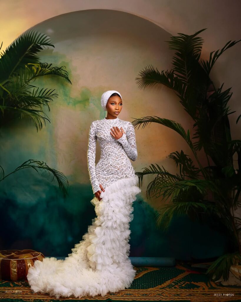To complement this, makeup artistry from Ruqayyarh’s Glamour ensures that a radiant glow is at the forefront. The finish is sleek, polished, and luminous, accentuating features with a level of shine that feels contemporary and fresh. This is not about layers; it is about application that highlights the beauty of the bride, so she shines in every photograph, every glance.