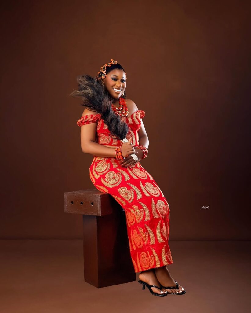 Ifeoma Okeke lit up the scene in a bright red wrapper and blouse covered in golden patterns. The color choice alone made her stand out, and the off-shoulder style added a modern, feminine touch. Her coral beads, worn in layers on her neck and wrists, gave her a look that rich traditional glow.