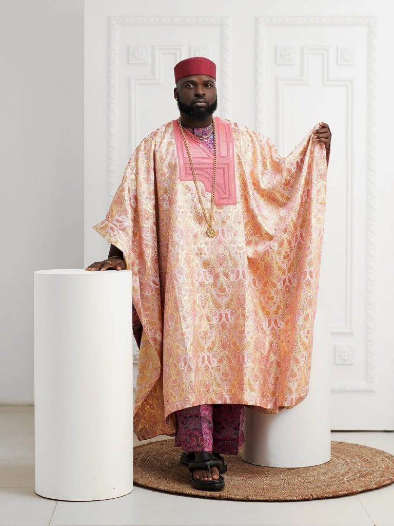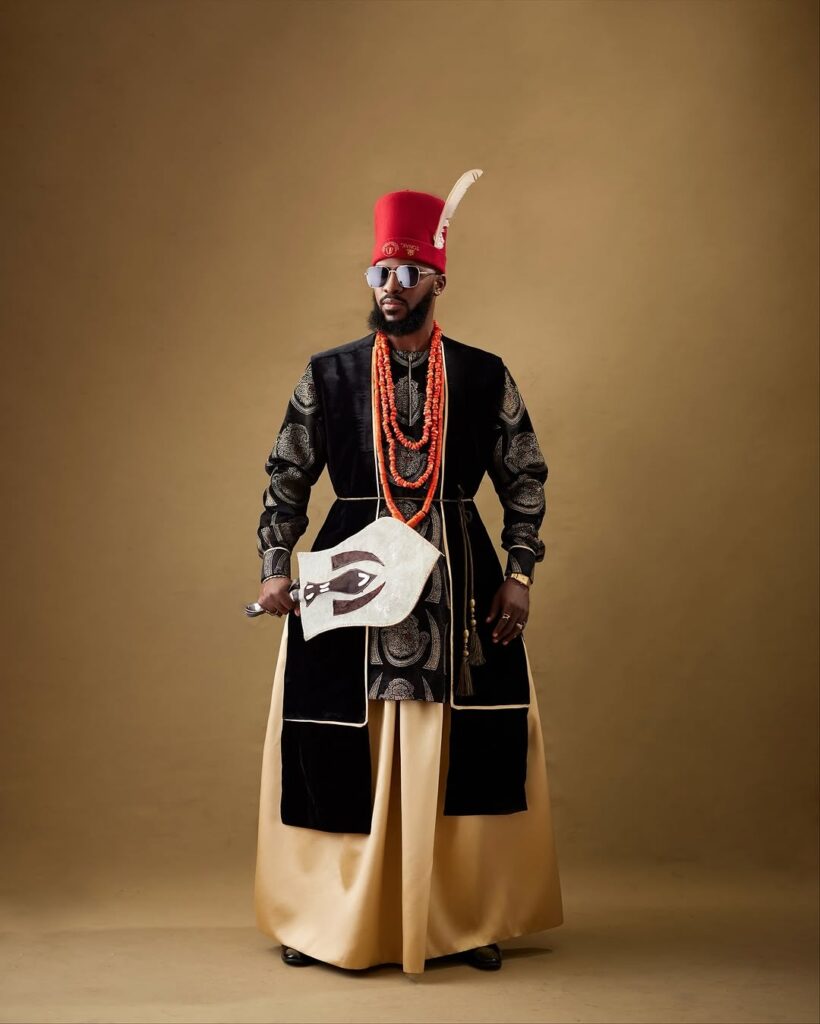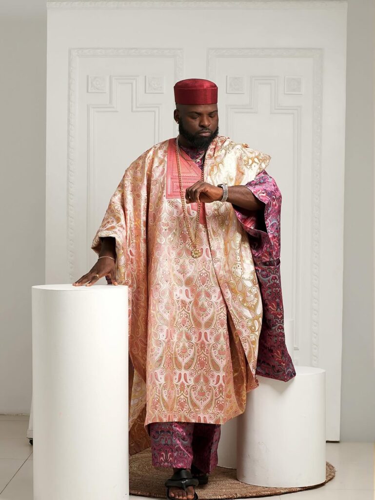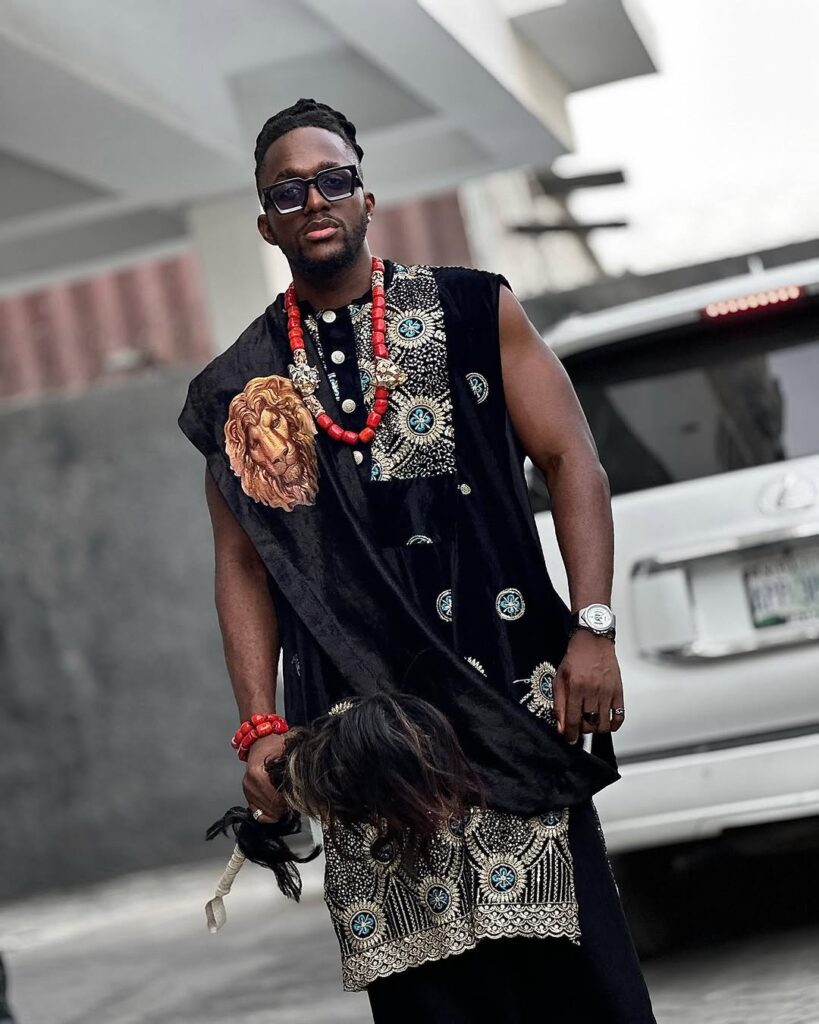 Akin Faminu and his fiancée looked every bit like a stylish traditional couple. Akin wore a cream and black agbada with patterned embroidery that gave off a classy, cultural vibe. He finished the look with coral beads and a red cap topped with a white feather, adding a royal touch. His dark sunglasses gave the traditional look a modern edge.