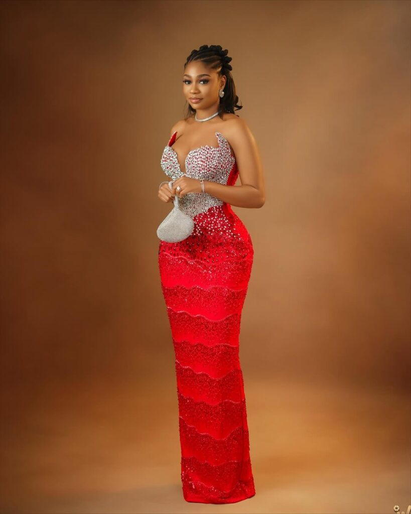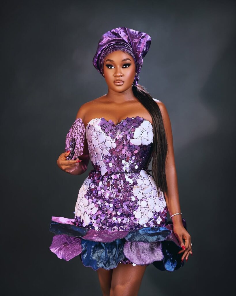 Sandra Okunzuwa went for a calm but classy traditional look in blue and white. Her off-shoulder dress was designed with floral embroidery and lace that looked delicate and soft. The fitted corset gave the outfit a modern shape, showing how traditional fashion can still feel fresh and trendy.
