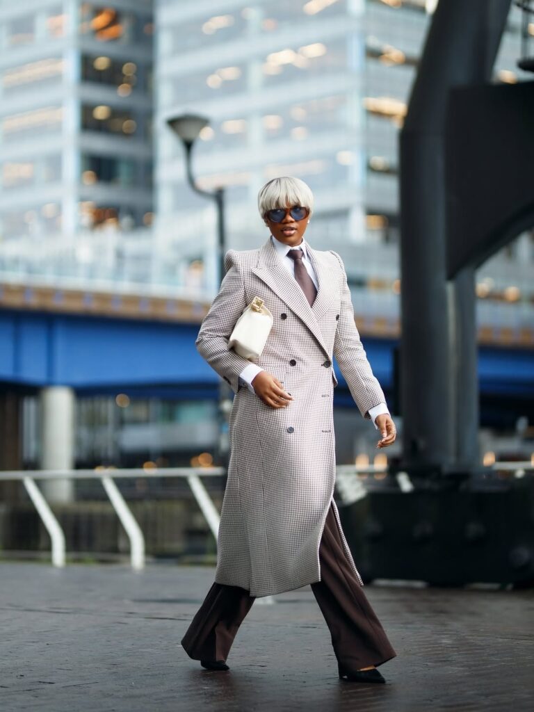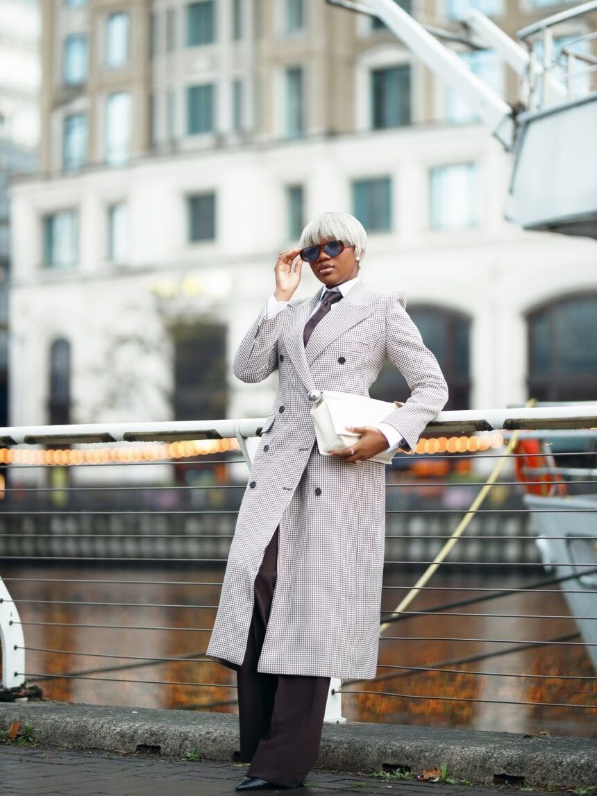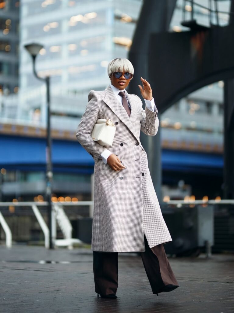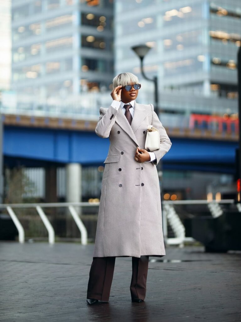 The checked double breasted coat dress is the main focus. It is neatly tailored and fits the body in a clean and flattering way. The structure of the coat gives a strong shape that works perfectly for the office. The length keeps it formal and professional, making it suitable for workdays, boardroom meetings, and corporate events.