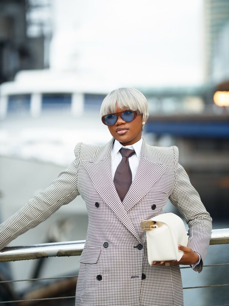 The accessories finish the look in a simple but effective way. The sunglasses add a confident attitude, the white clutch keeps things neat and modern, and the short light hairstyle gives the outfit a stylish edge. Nothing is overdone, yet everything stands out.