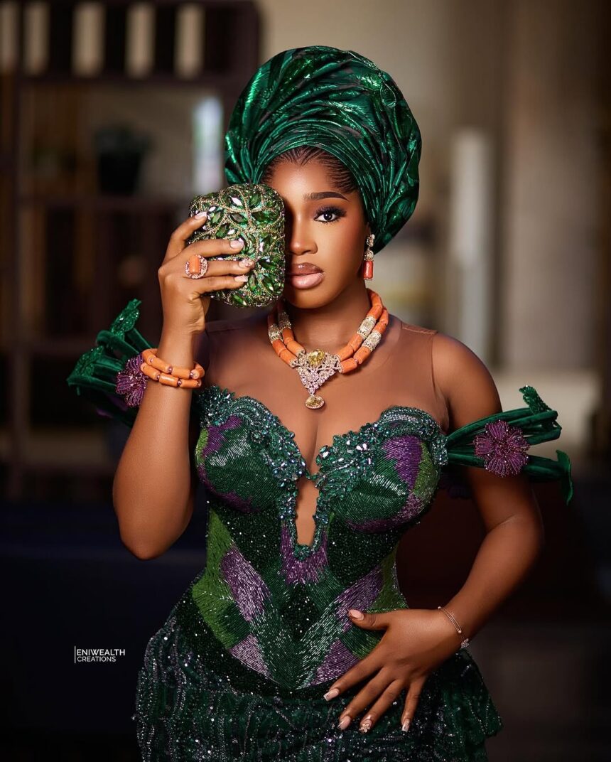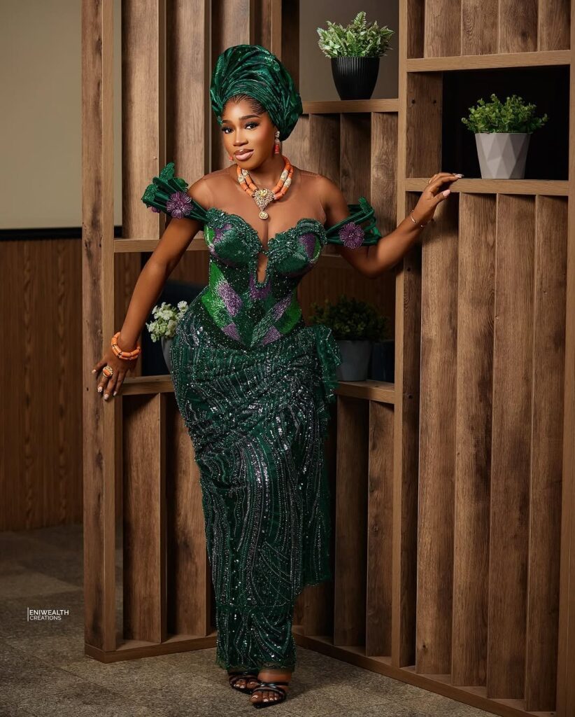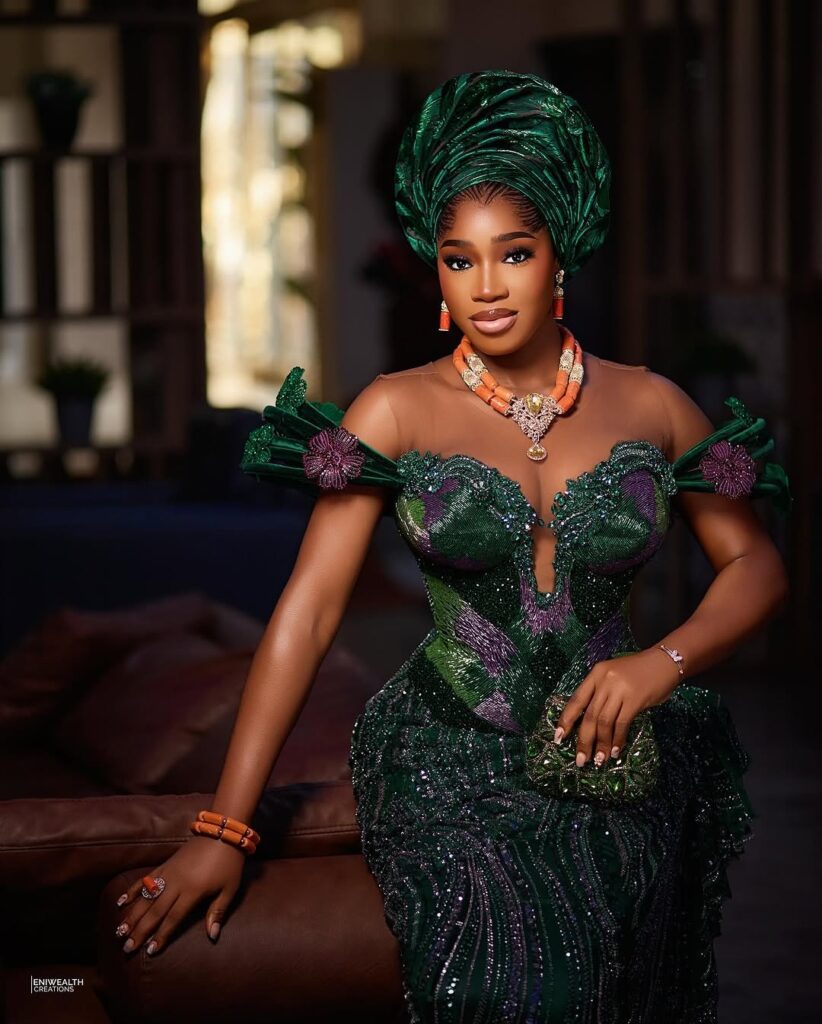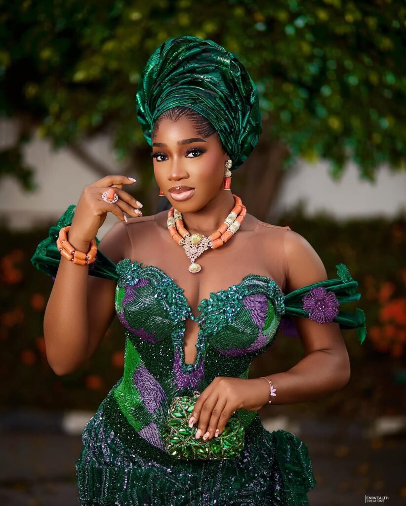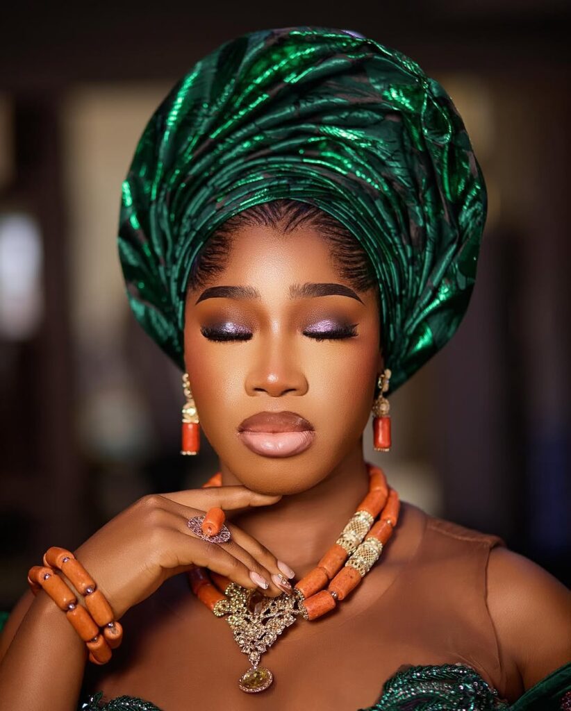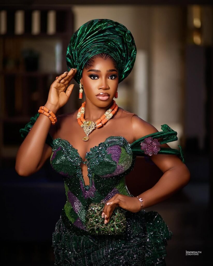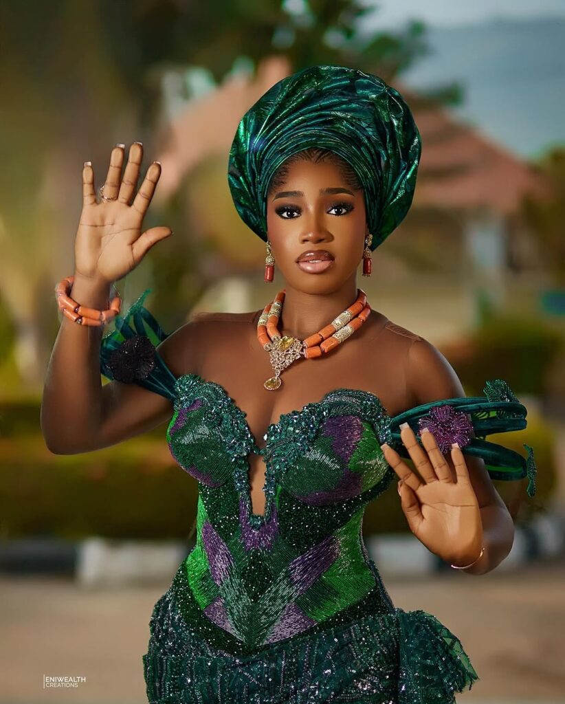 This bridal look is pure tradition with a bold, modern glow. From the rich green tone to the detailed craftsmanship, everything about this outfit feels intentional and powerful. It is the kind of look that turns a traditional wedding into a visual moment people will talk about long after the drums stop beating.
