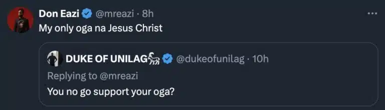 In response, Mr Eazi said, “My only oga na Jesus Christ,” making it clear he wouldn’t take sides.