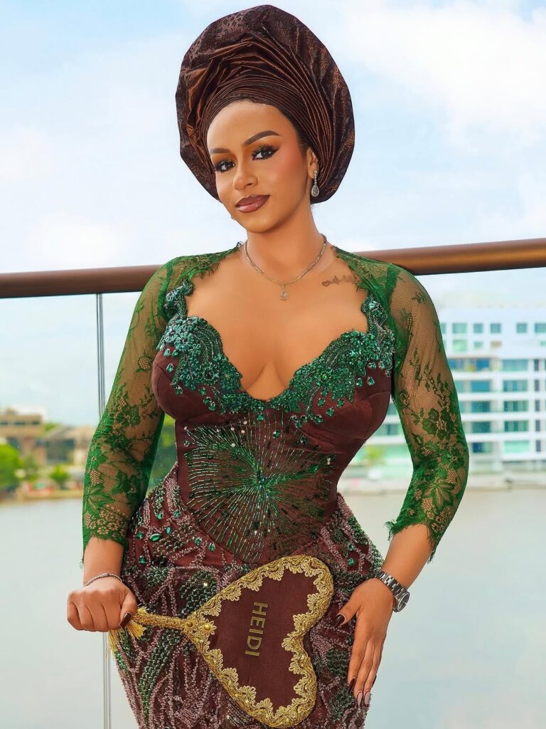 And let’s talk about that gele for a second, the IV brown shade complements the gown perfectly. It’s neatly tied and sits like a crown, giving off strong “queen of the party” energy. The green beadwork on her gown catches the light so effortlessly that you can’t help but stare a little longer.