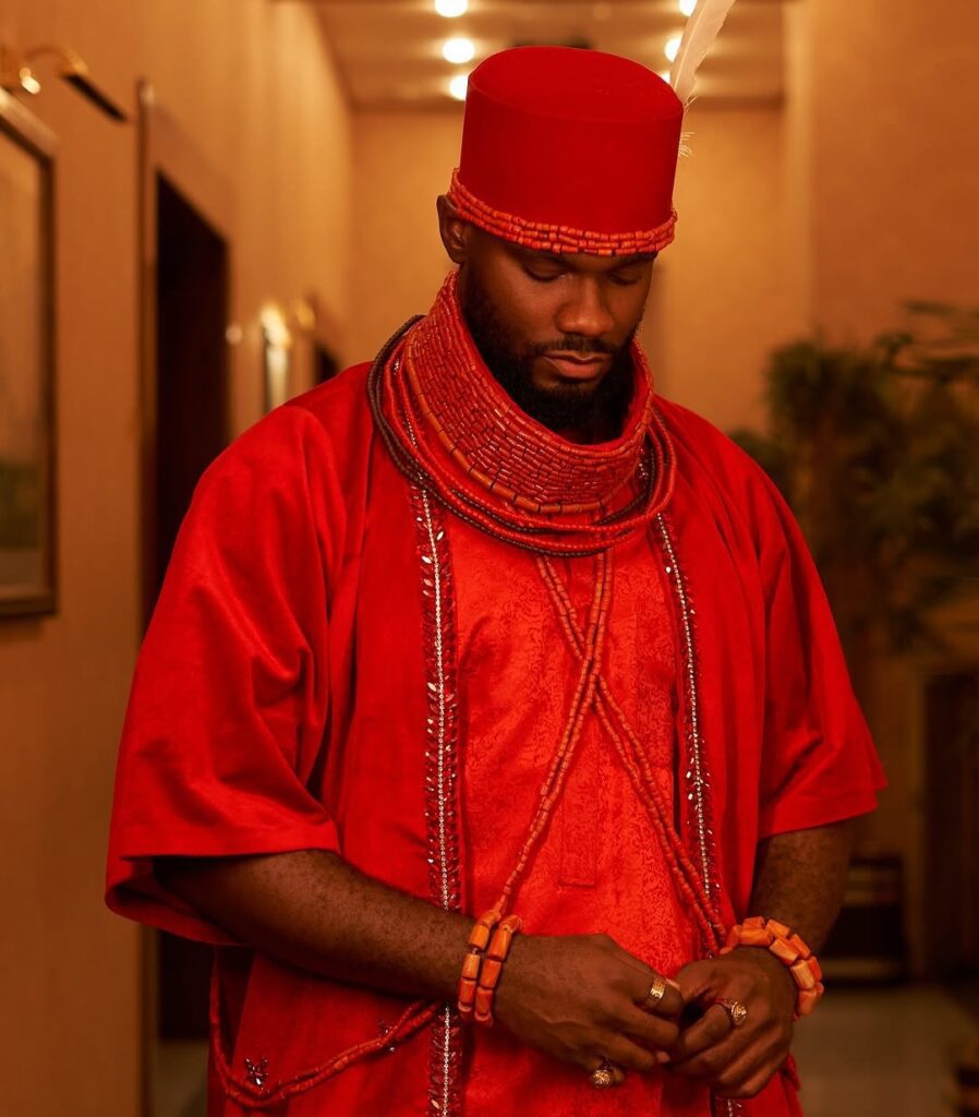 His outfit was detailed with shimmering designs that caught the light beautifully. He wore a matching red velvet cap, and his neck and wrists were stacked with coral beads, giving him that royal Benin-inspired finish.