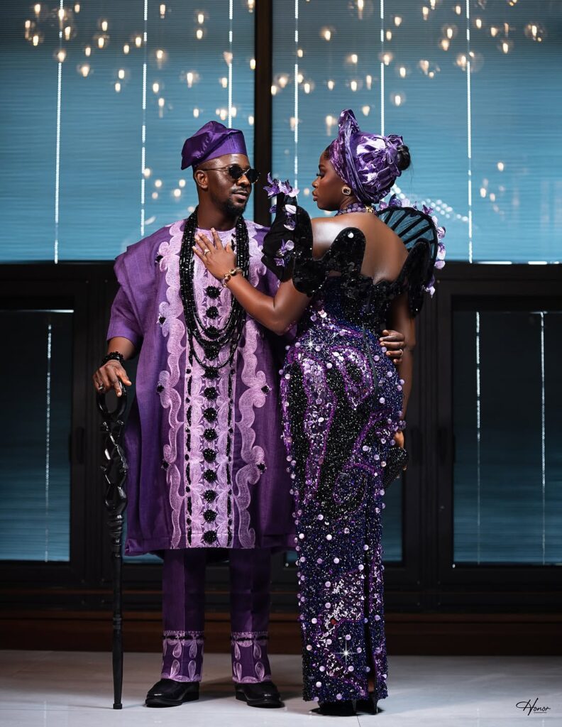Let’s break down the looks because wow, they nailed it. Okopi is, indeed, looking every bit the king in his regal agbada, embroidered with soft pink and lavender detail, plus those intricate floral patterns and black bead accents. He topped it off with a matching purple fila and some sleek sunglasses for that extra dash of cool.