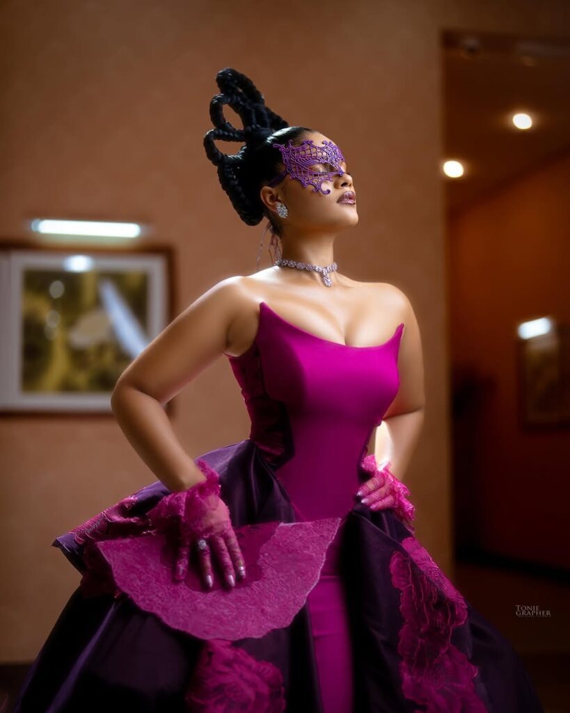 Her accessories take the look to another level. The purple face mask adds mystery and drama while still blending perfectly with the dress. It feels bold and intentional. The choker necklace sits neatly on her neck and adds a soft shine without taking attention away from the outfit. The gloves give old school glamour and make the look feel complete.
