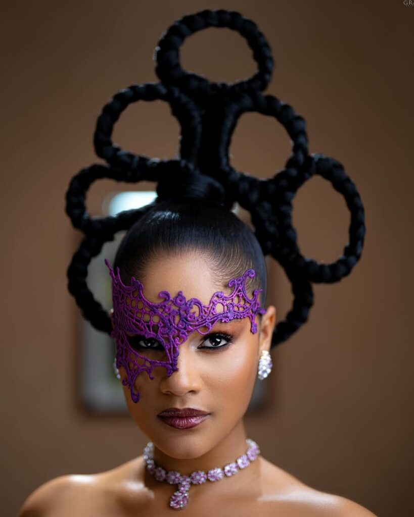 Her hair is styled into an artistic braided updo that stands tall and strong. It feels African, creative, and powerful. This hairstyle alone tells a story and matches the boldness of the dress. Her makeup is clean and smooth with glowing skin and defined eyes that balance the drama of the outfit.
