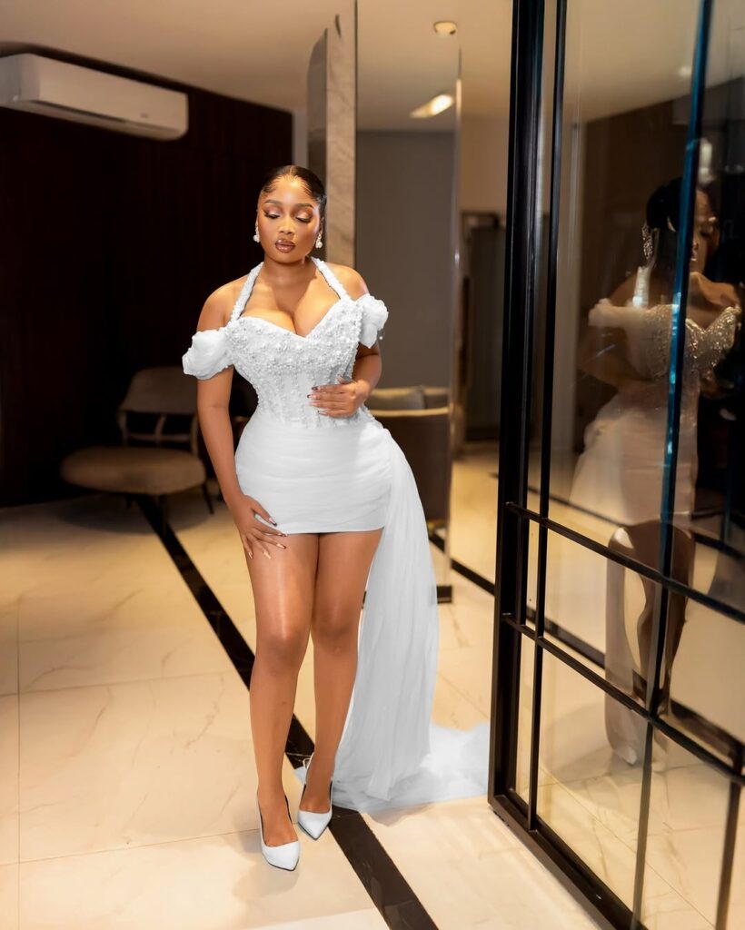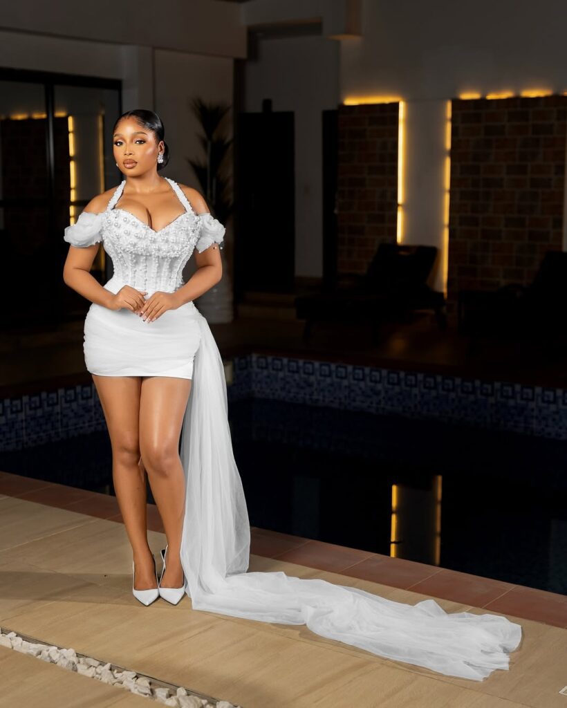 Let’s jump right into this amazing creation designed by the talented Zahra D Lumiere. The mini dress is no less than stunning, ideal for any bride-to-be who wishes to mix love with some spice. Just imagine an off-the-shoulder neckline that gives some playful hints of flirtation with a sweetheart corset bust designed with glittering pearls.