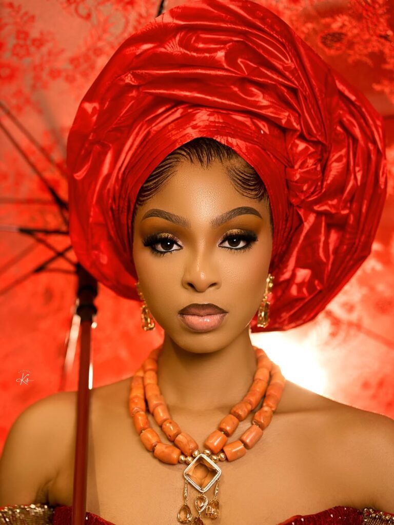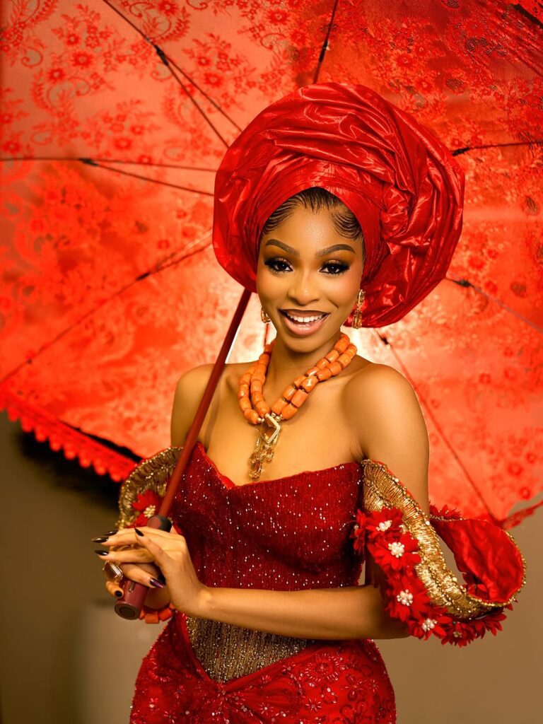 The real magic of the entire look is the way the accessories and finishing touches come together to tie the look together perfectly. The stylish red gele, tied to perfection, frames the face of the bride, adding height and presence to the overall look. The inclusion of the hand fan and umbrella also plays well into the traditional look of the bride, particularly the Igbo bride.