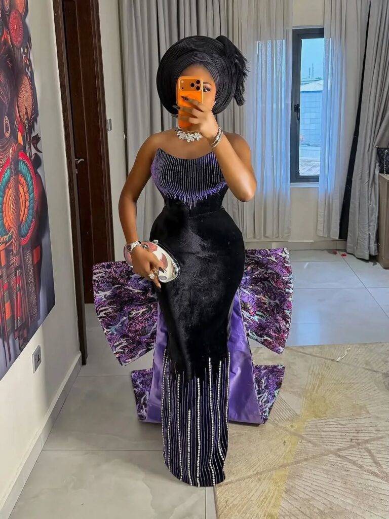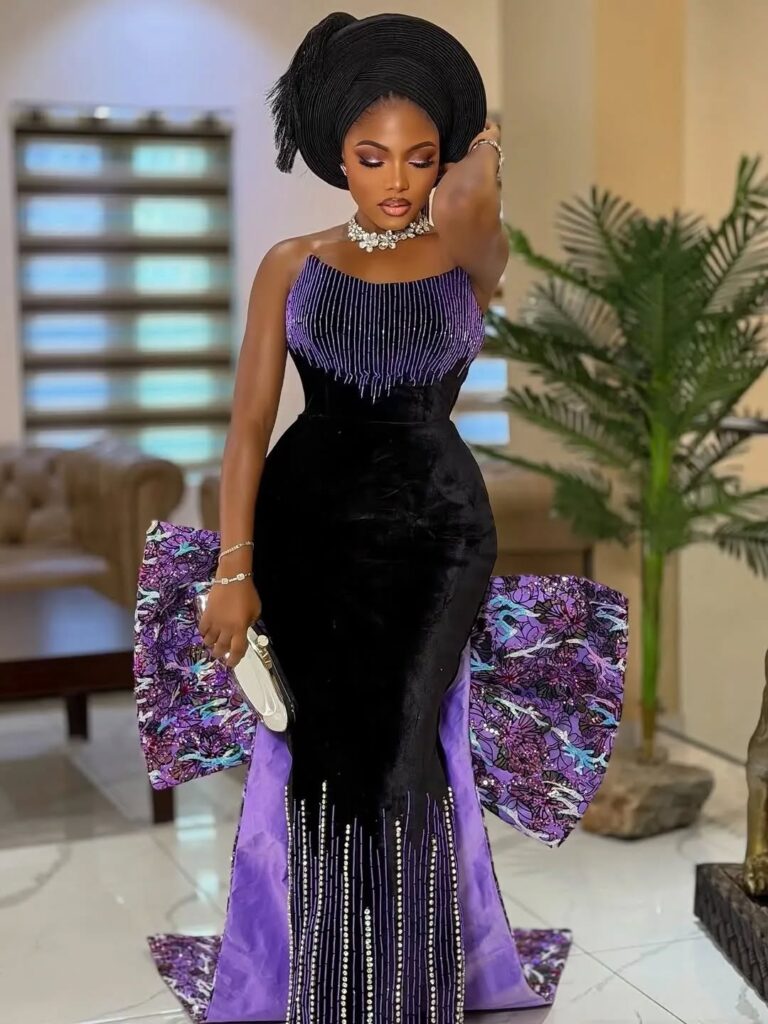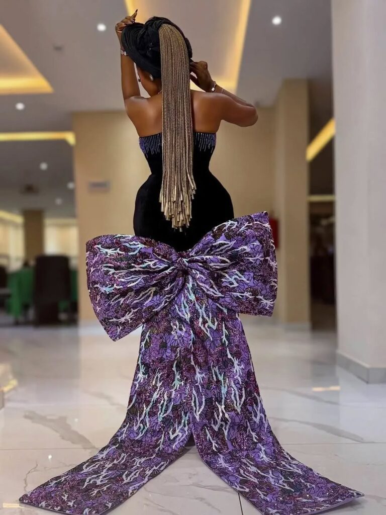 A striking black gown with a dramatic purple bow has captured attention for its perfect balance of elegance and bold design. This fashion gown has a tight strapless bodice made from a black material decorated with small beads and fringes.