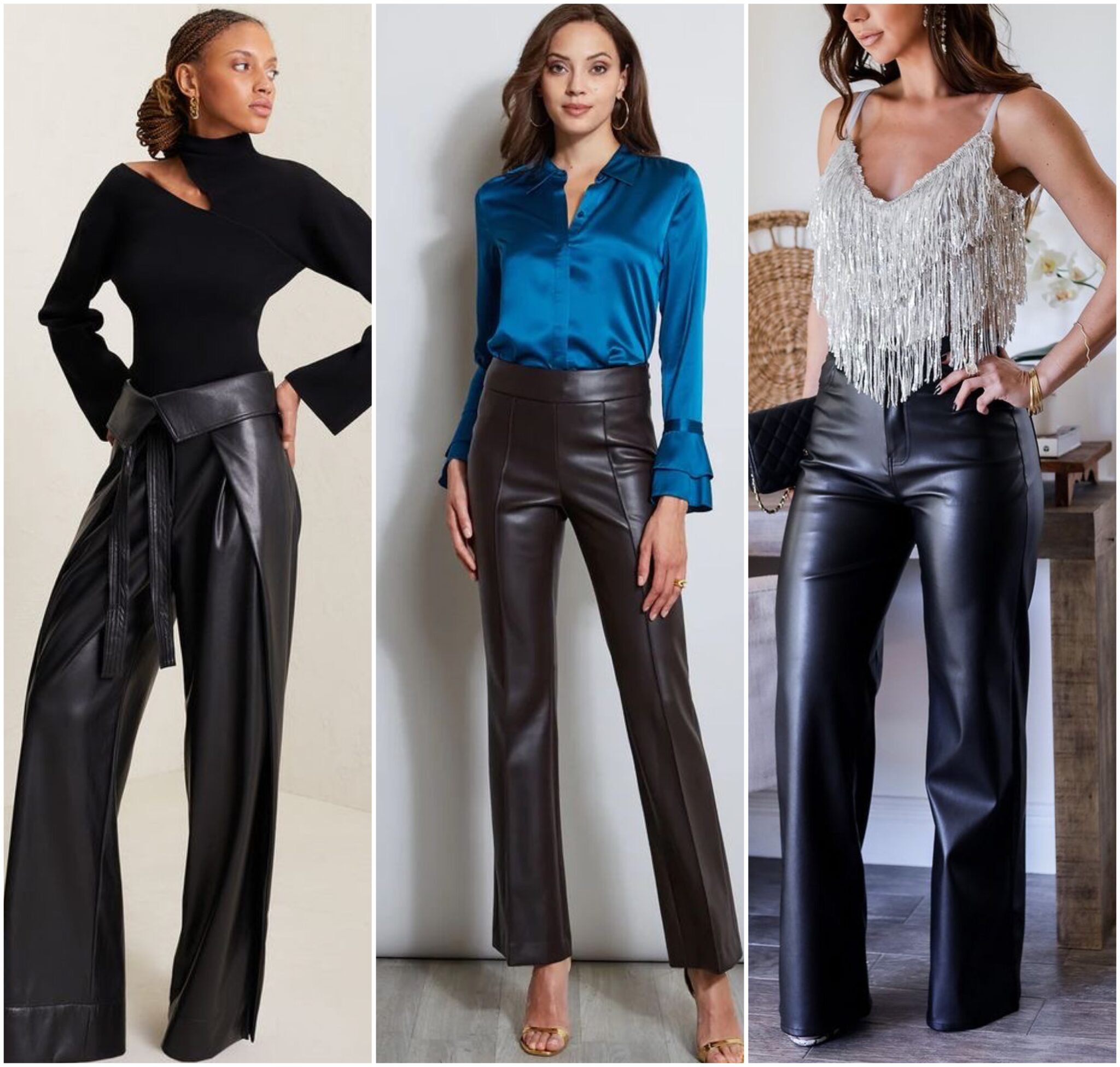 Pairing your leather pants with a silk blouse and heeled boots is a perfect outfit pick for an evening event. Pick a blouse with details such as lace or ruffles to stand out.