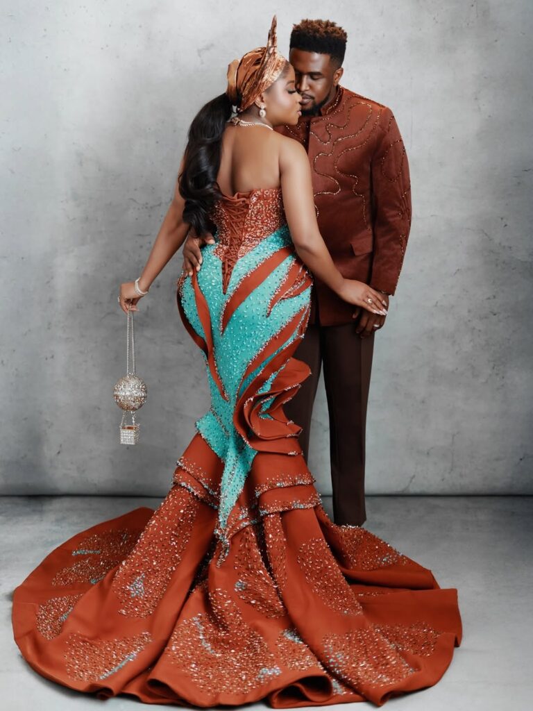 Veekee James, steps out in a striking mermaid gown that celebrates her curves flawlessly. The dress blends rich rust brown with bold turquoise tones, arranged in flowing patterns that create movement and drama from top to bottom.