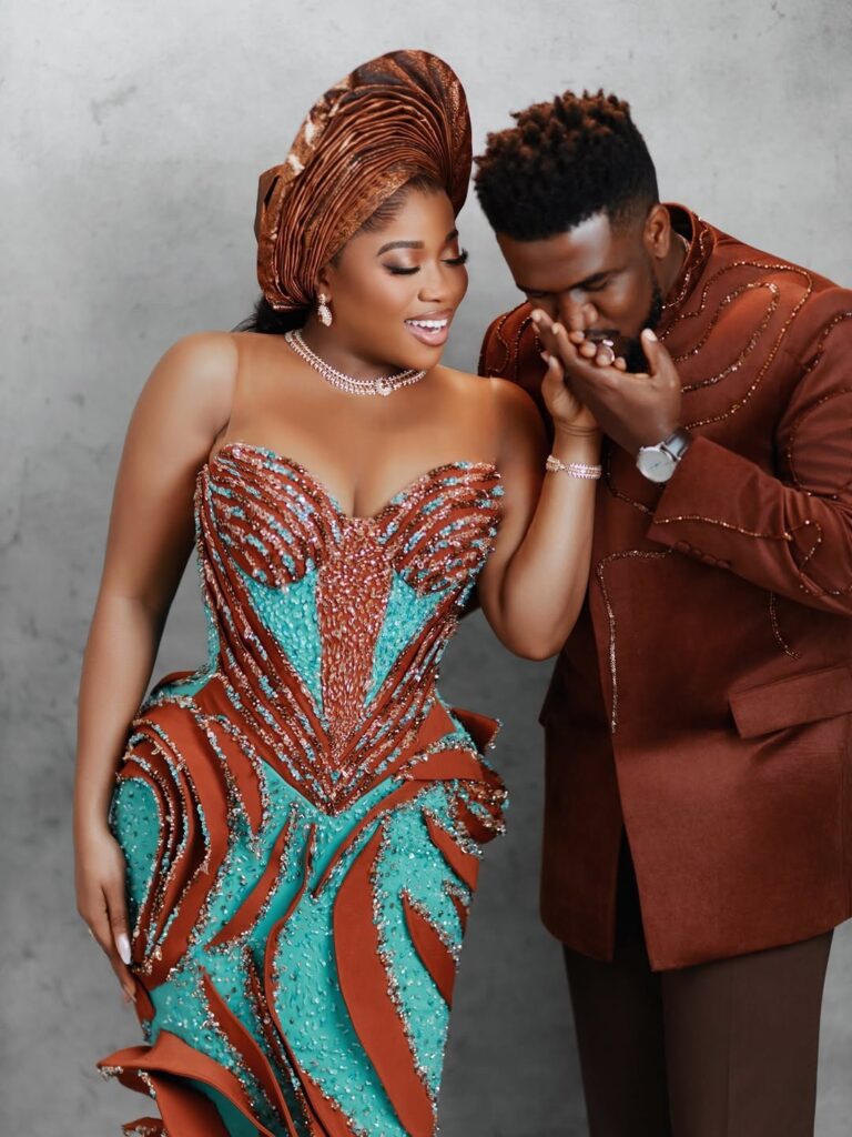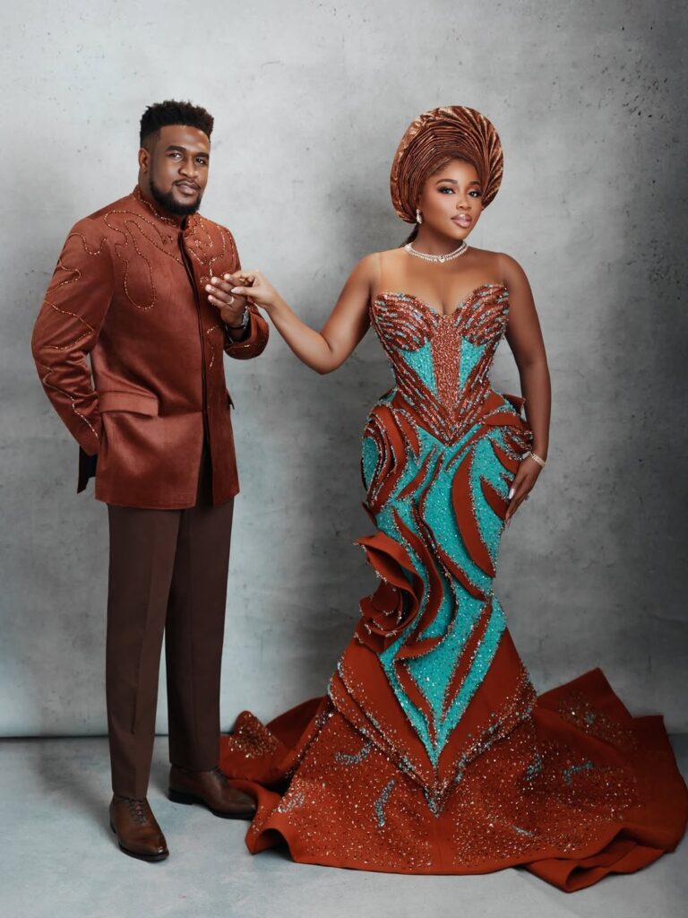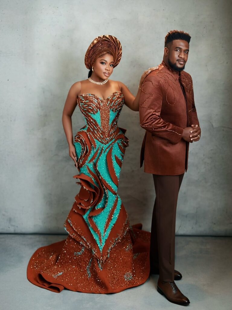 Femi Atere, complements her effortlessly in a refined brown traditional suit. His outfit is clean and sharply tailored, with subtle details that give the fabric character. The fit is relaxed yet polished, paired with well pressed trousers and sleek brown shoes. His calm, confident presence balances the boldness of Veekee’s look, creating a picture of unity and strength.