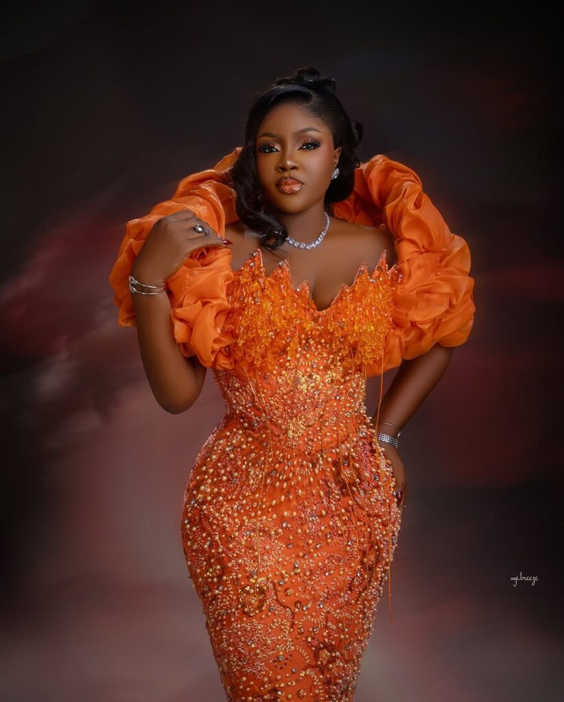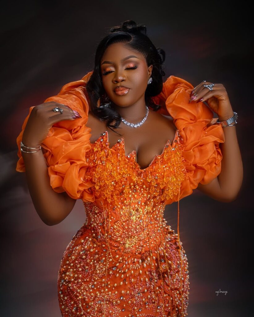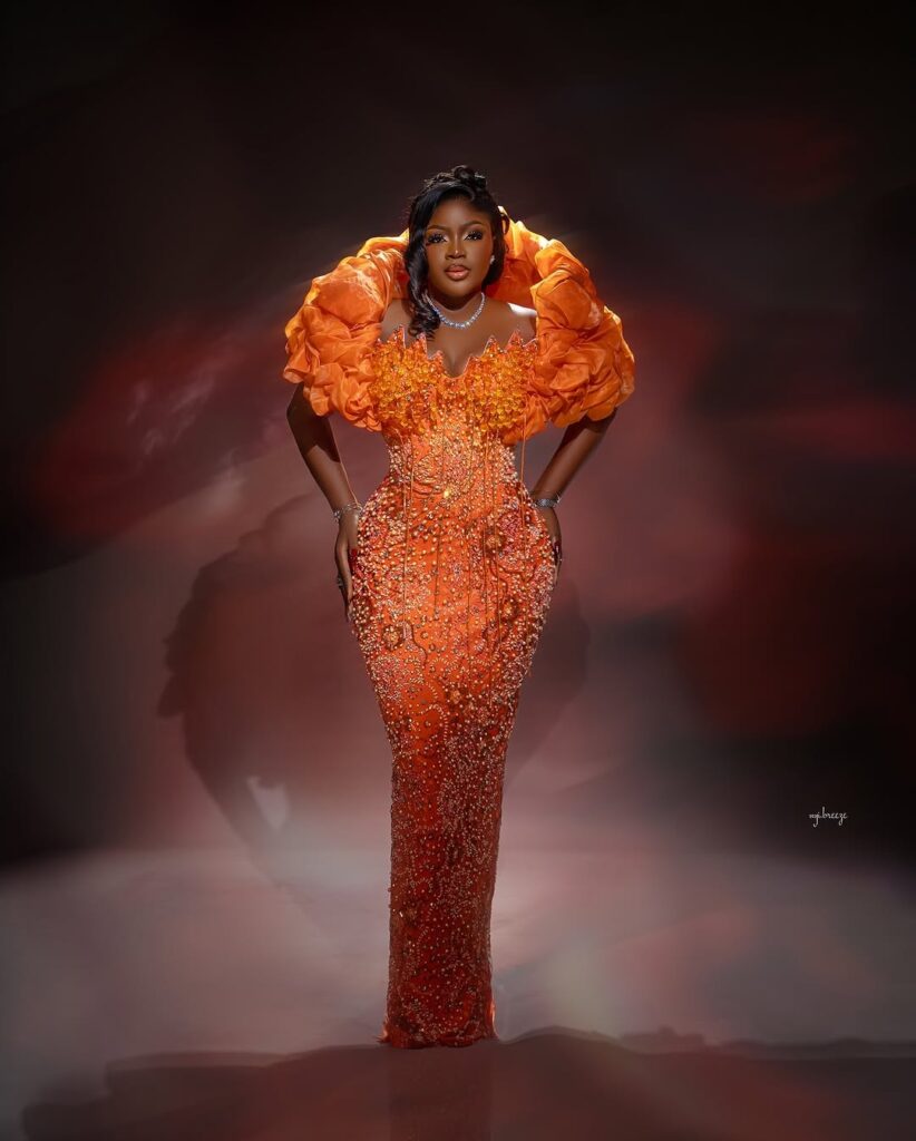 The rich orange color already brings that bold, happy energy, but the details take it to another level. The gown is fitted from top to bottom, hugging the body in a way that shows off every curve beautifully. The corset-style top gives structure and holds everything in place, creating that clean, snatched look brides love.