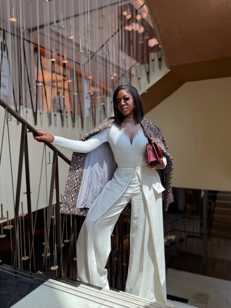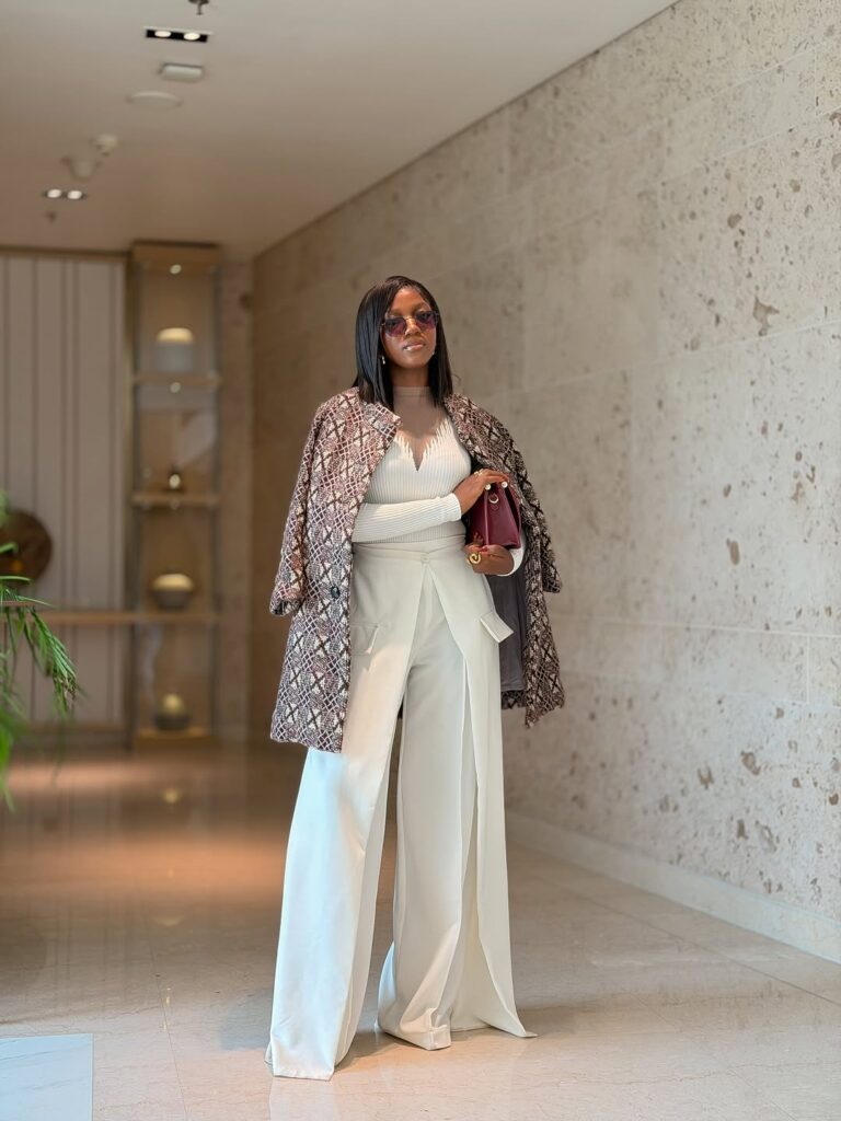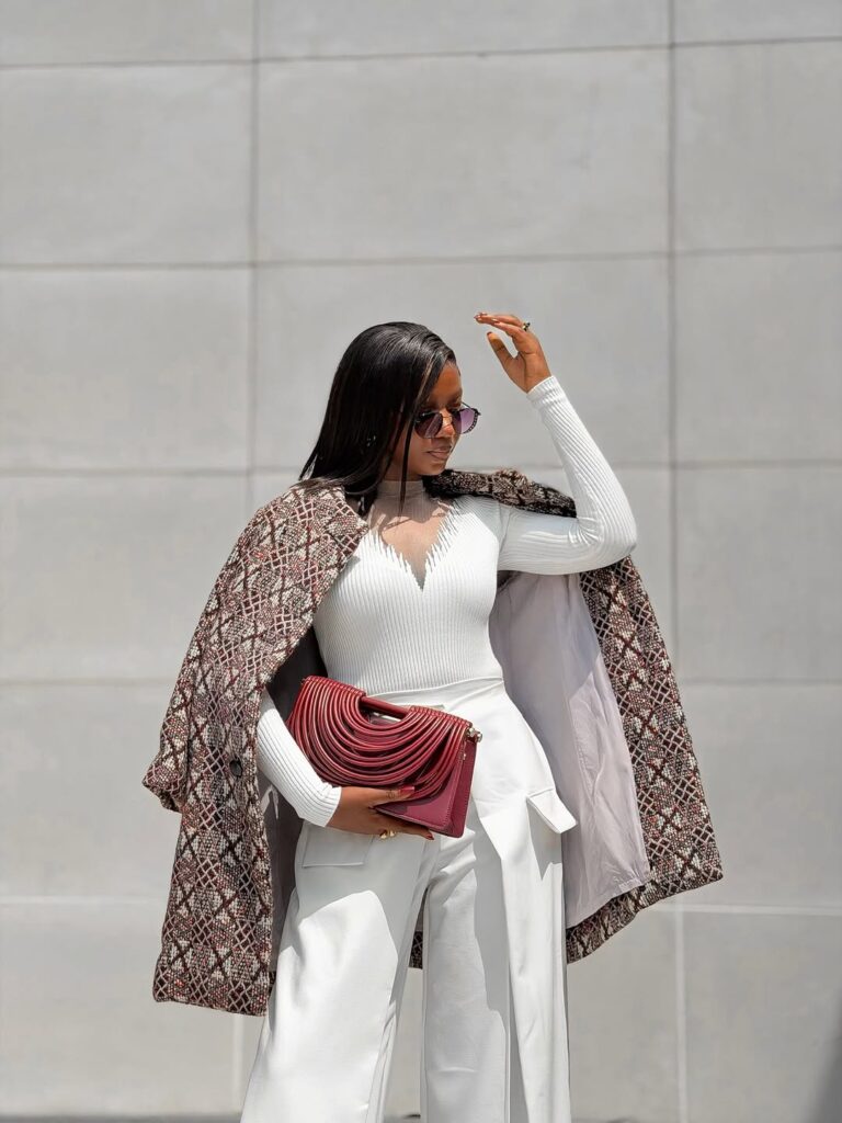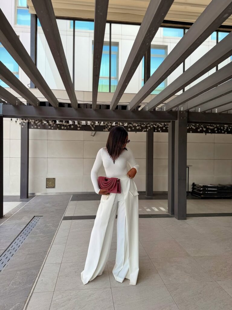 The clean white base immediately sets a work-appropriate tone. The fitted top and tailored trousers create a sharp, intentional silhouette that feels office-ready while still allowing room for ease. It’s the kind of look that works just as well for a meeting as it does for stepping out afterward.