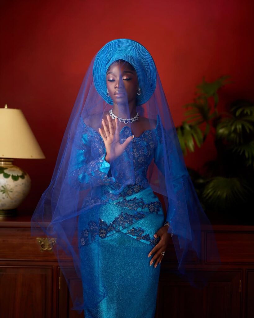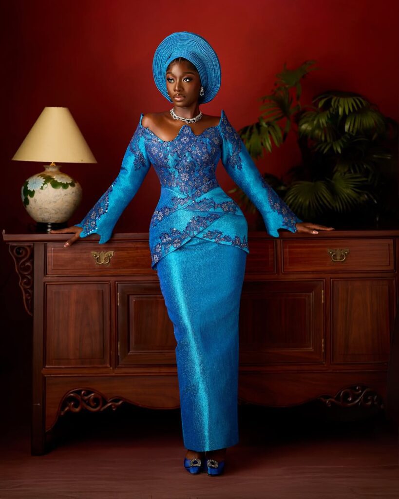The gele is the crown of this entire look. Tied wide and tall in the same rich blue fabric, it sits on her head like it was born there. A well-tied gele like this one tells the room that a woman of honour has arrived, and that energy is exactly what a traditional wedding deserves.