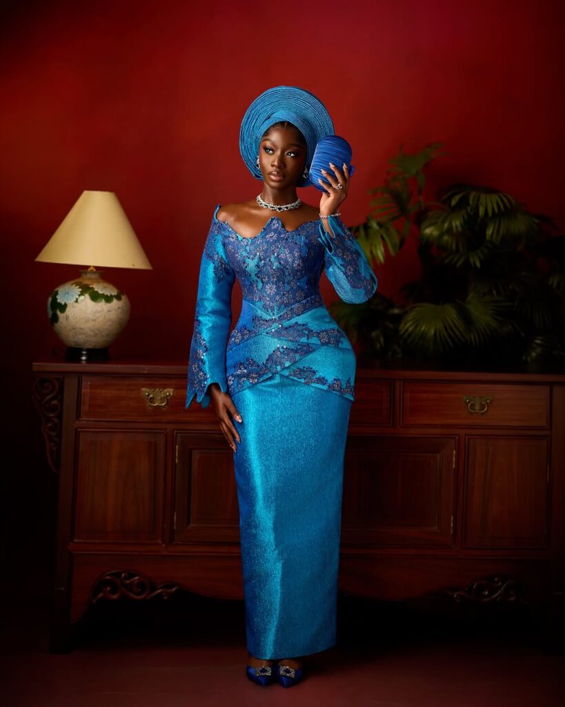 This look works because it stays true to Yoruba tradition while feeling completely current and high fashion. The colour is bold without being loud. The silhouette is modest but deeply sensual. The styling is intentional all the way down to the clutch bag peeking through her hands.