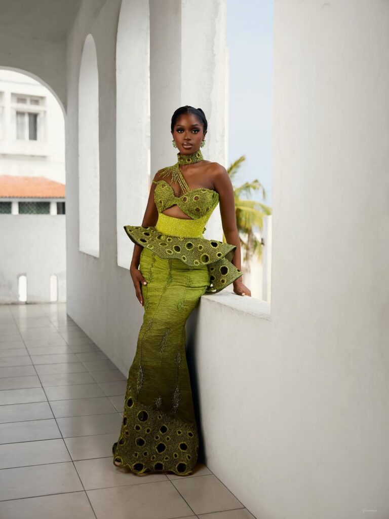 A few styles incorporate modern elements such as structured shoulders on a traditional buba and wrapper set, or a jumpsuit that reinvents the traditional two piece without losing the original’s soul. Accessories are also thoughtfully included, such as gold pieces, beaded bags, and stilettos that add length without compromising comfort for dancing.