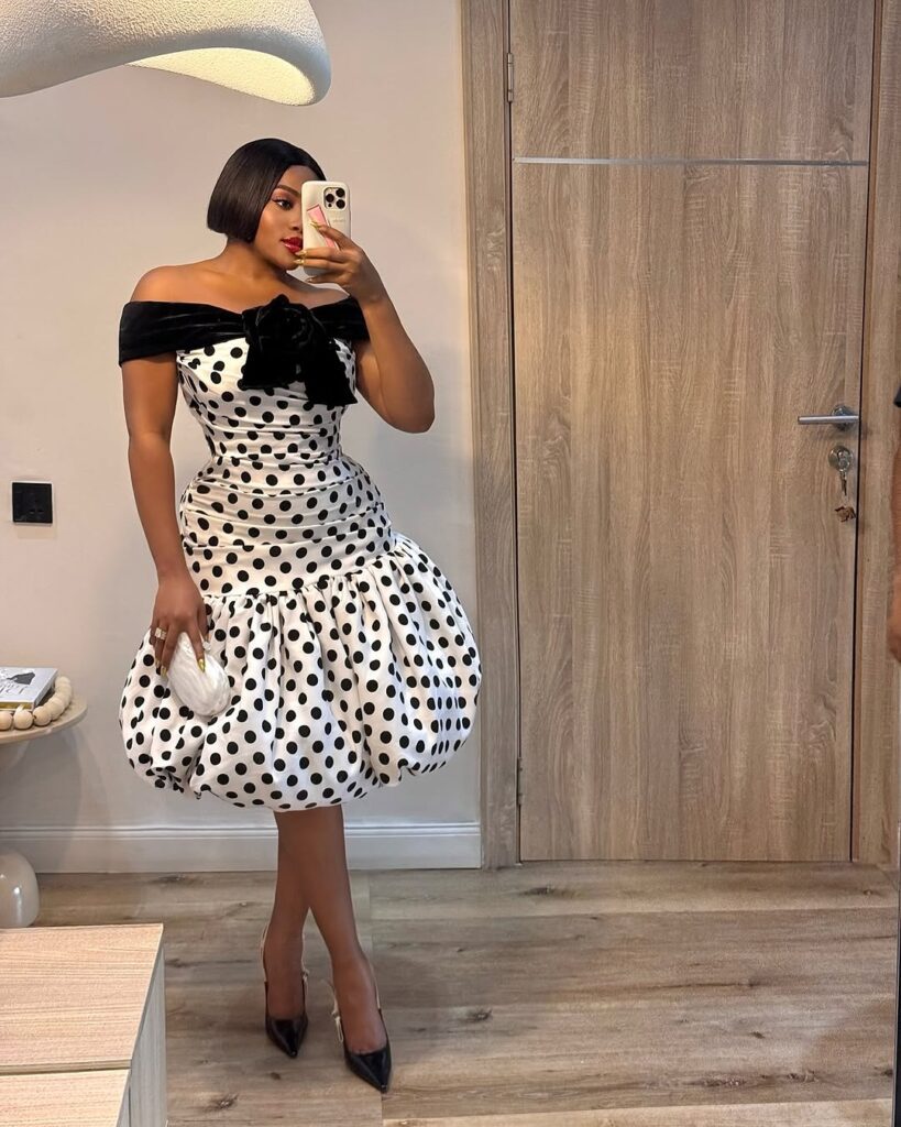 She stepped out in a stunning black-and-white polka dot dress that screams elegance with a side of drama. The dress hugs her figure beautifully before flaring out into a fun, bubble-shaped hem that gives major vintage vibes. The polka dots are classic, making the entire look super timeless.