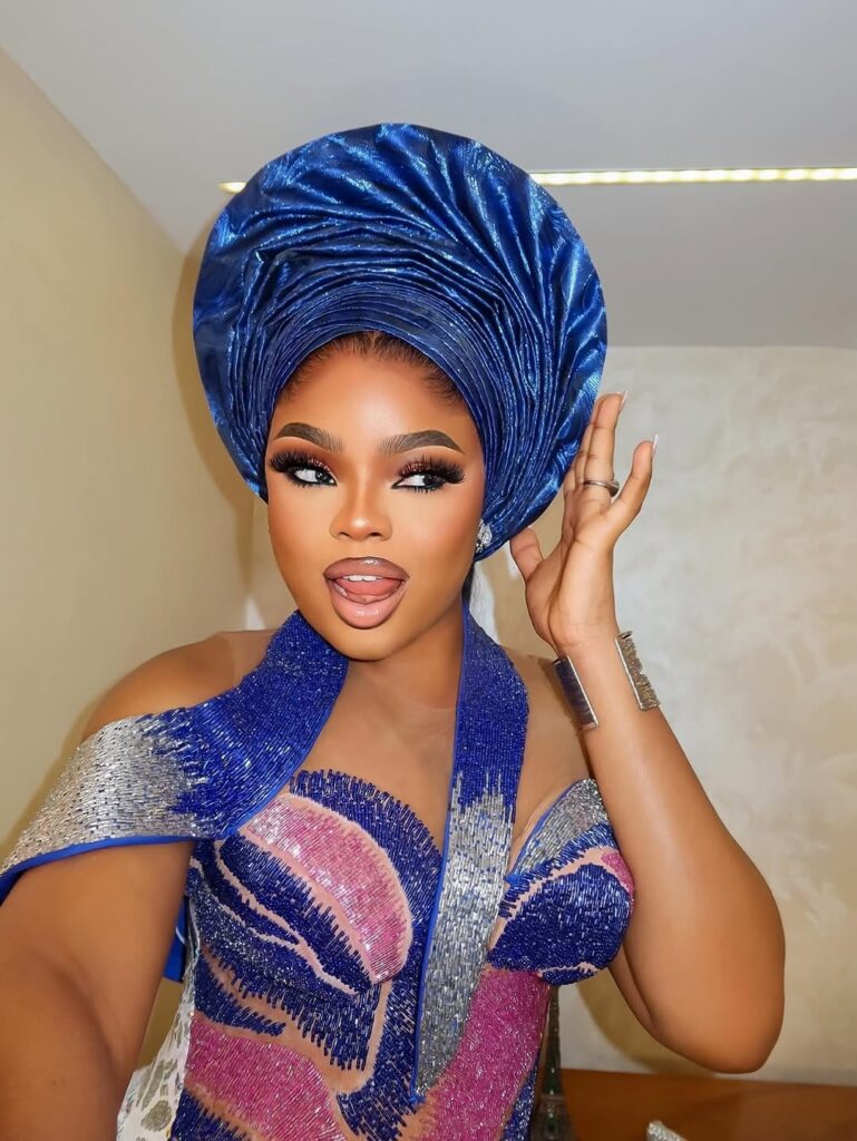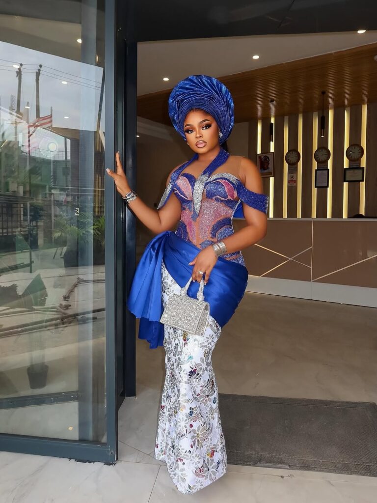 The headwrap alone is a statement. A shiny blue gele is tied tall and neat. It instantly gives a royal vibe. The gown is a fitted corset style made from glittery fabric in shades of blue, pink, and silver. It is off-shoulder, so it shows just enough skin while keeping things classy.