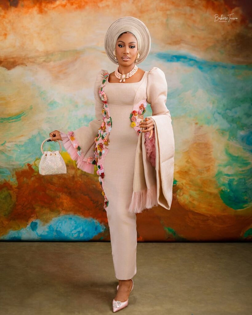 It is accompanied by an equally beautiful pleated gele by Demmy Gele, which features artistic details that are characteristic of Yoruba traditions. The gele is more than just an accessory, it is the perfect centerpiece that brings everything together with poise and elegance.