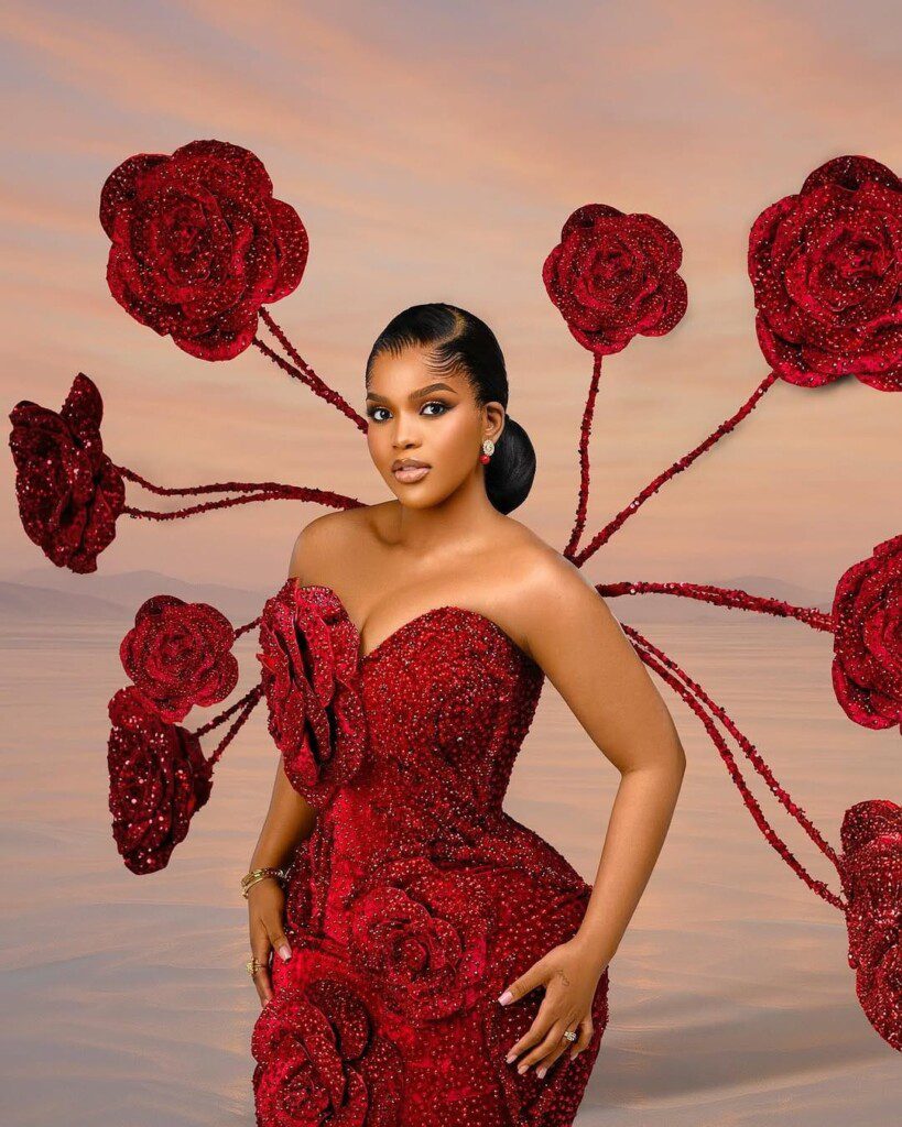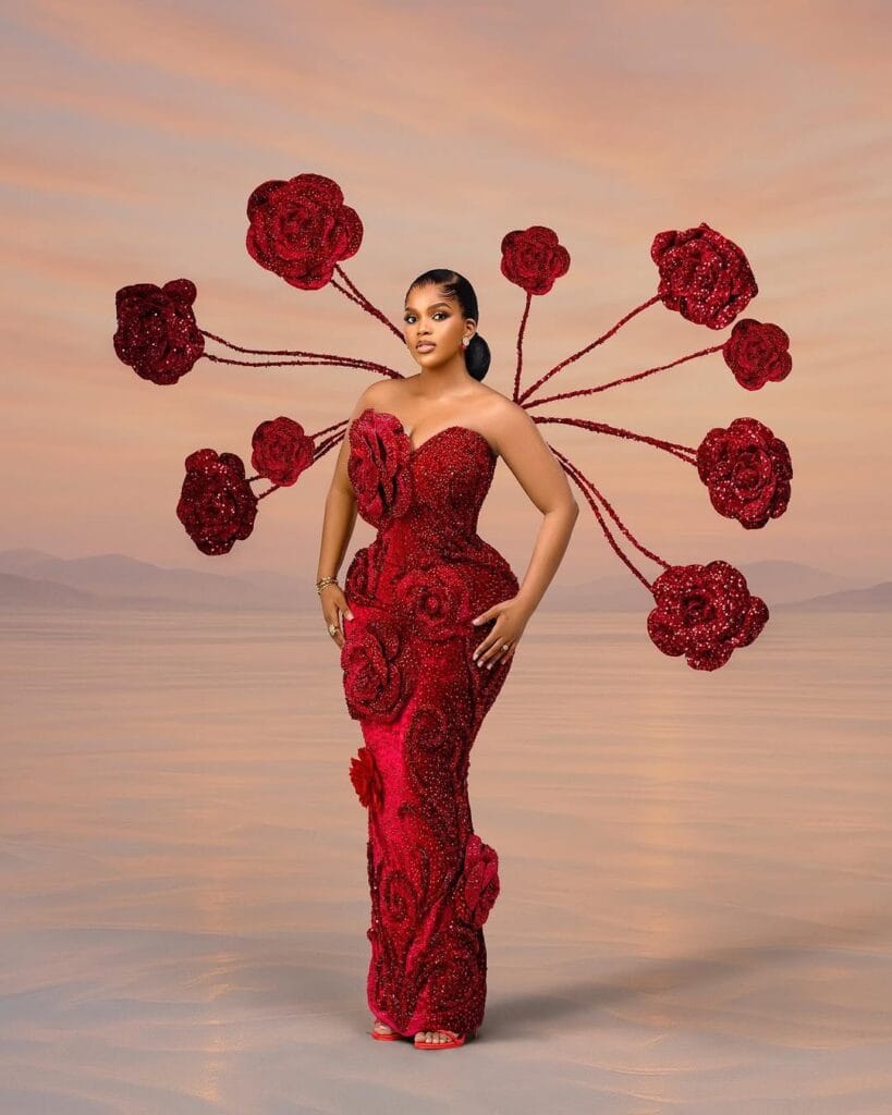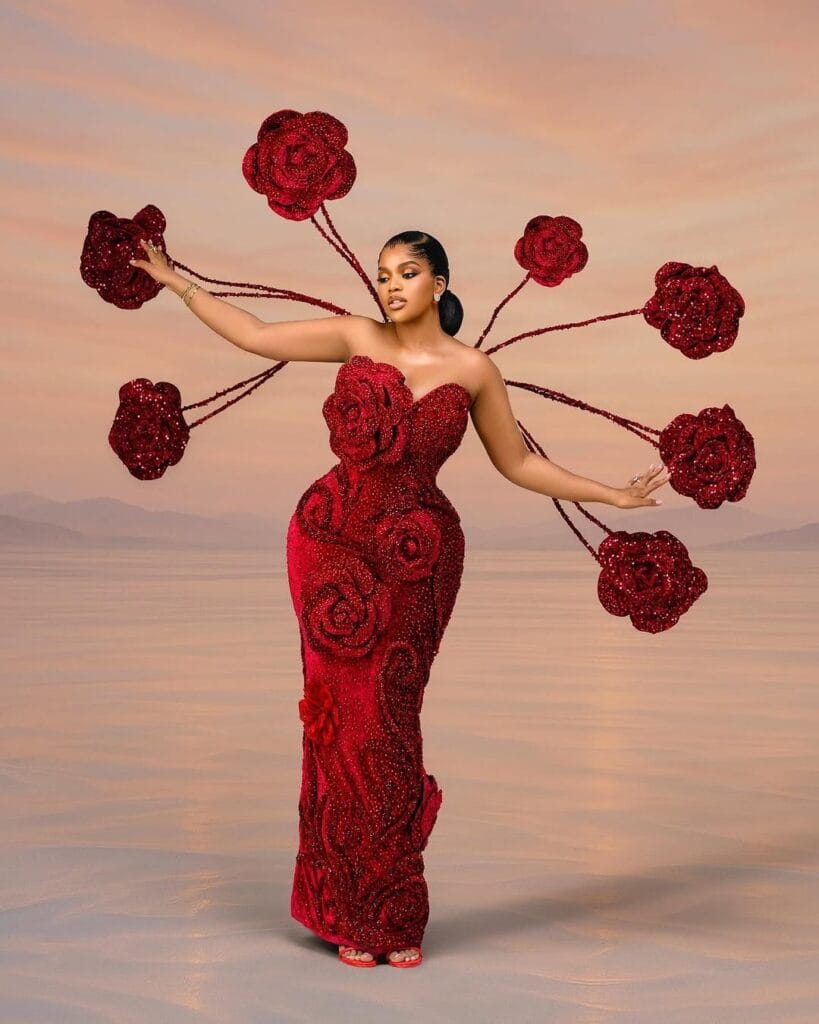 There are fashion moments that capture attention and then there are moments that command it. This stunning rose-inspired gown is one of the latter. Designed in rich crimson tones and sculpted with intricate beadwork, the look transforms the idea of elegance into a bold fashion statement that celebrates femininity and artistry in full bloom.